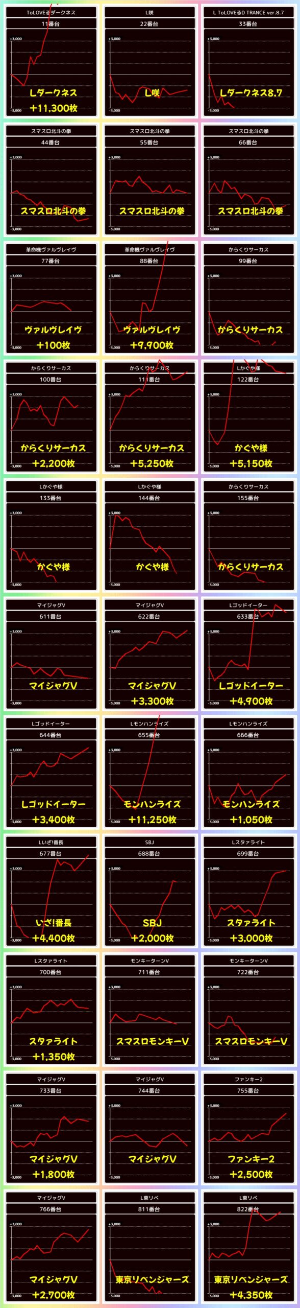 全系濃厚の2機種は稼働&結果ともに抜群にヨシ!炎炎からは15000枚オーバーも出現!ジャグも3000枚オーバーや5000枚オーバーが大量と、お宝台の中でもかなり高品質だったように思えますね。