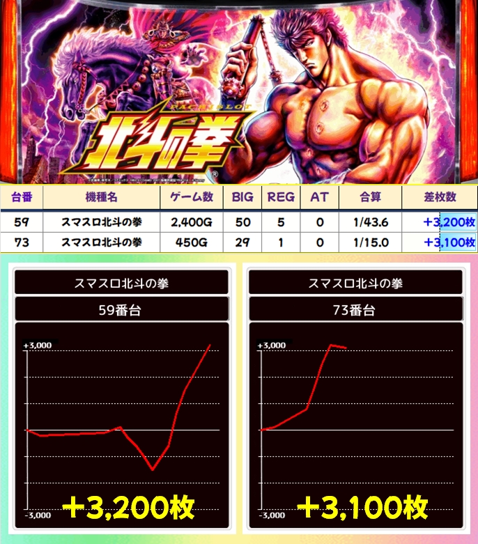 スマスロ北斗は2000枚超は2台でしたが、1000枚超のプラス台は複数ありました!