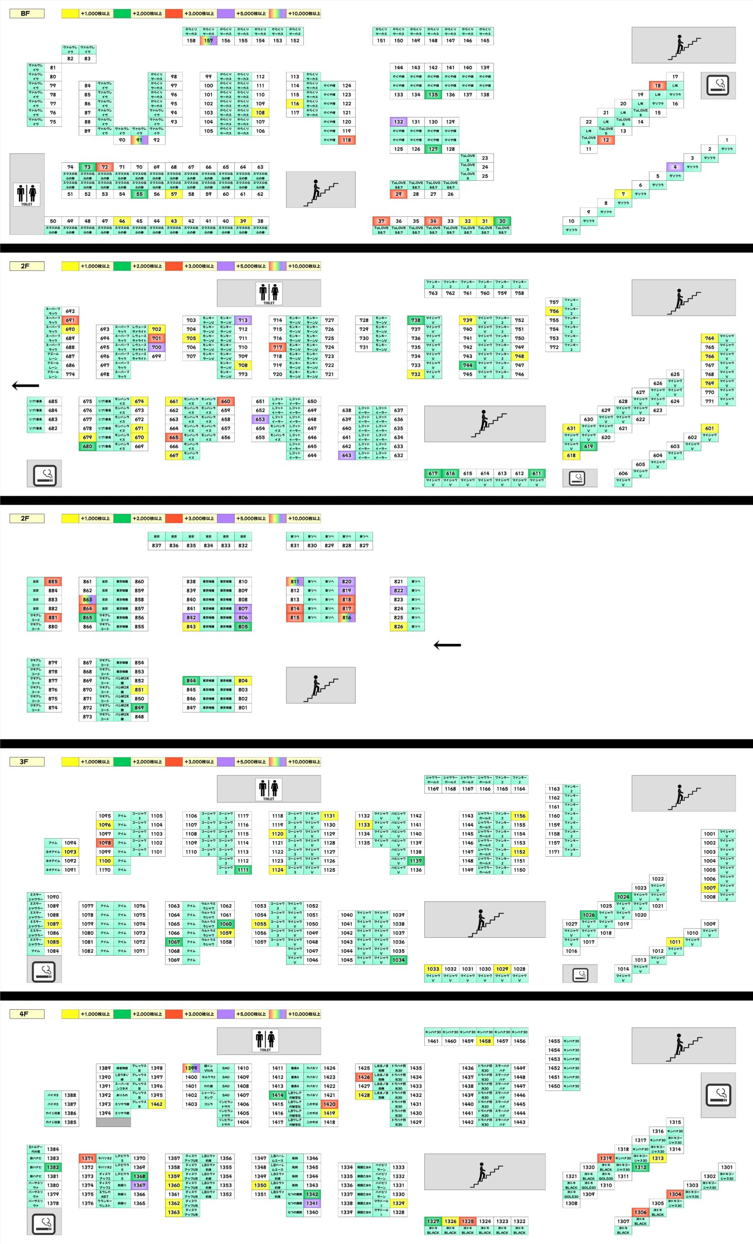 吉宗の+11300枚や緑ドンVIVAの+11500枚、ダリフラの+8500枚など仕掛け以外にも多くの大量出玉を確認。いずれのフロアからもお宝台を確認でき、幅広い機種から好成績台が出現していましたね!