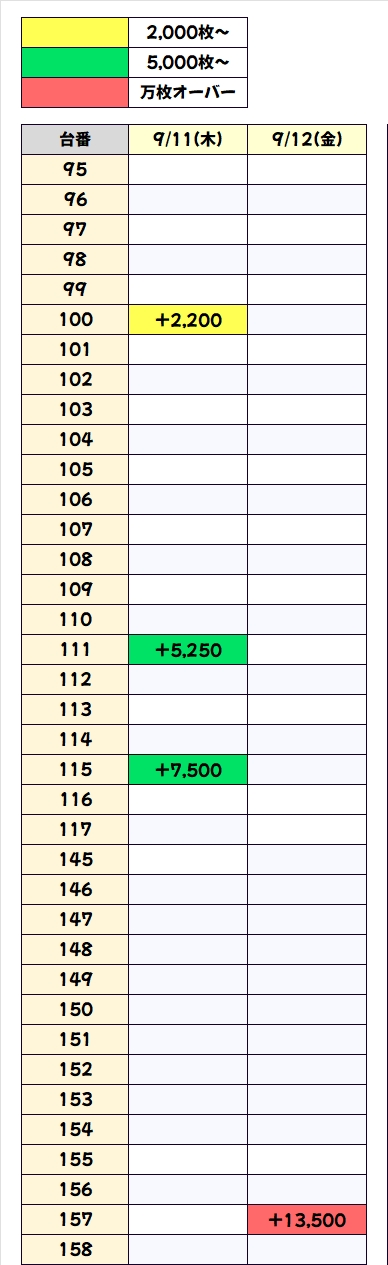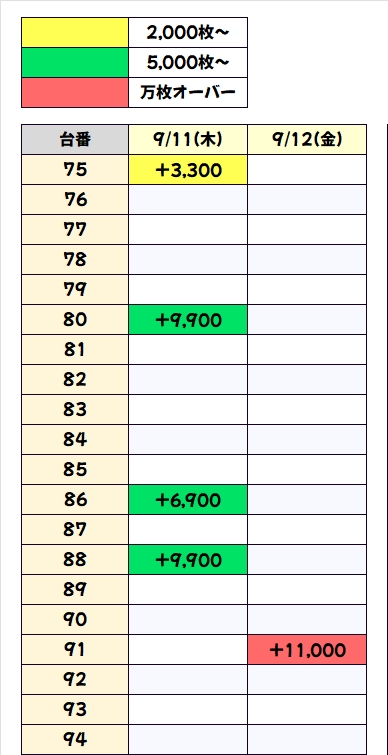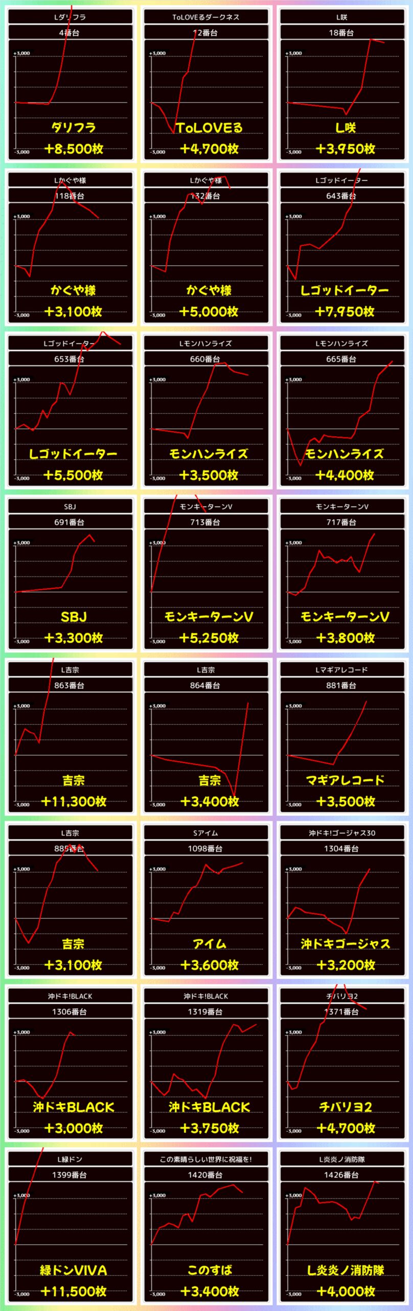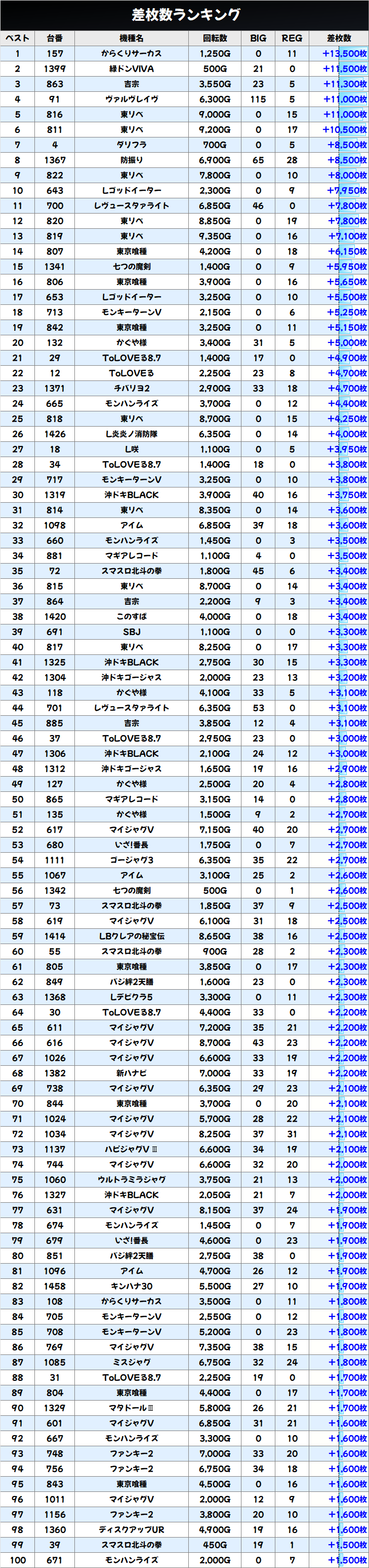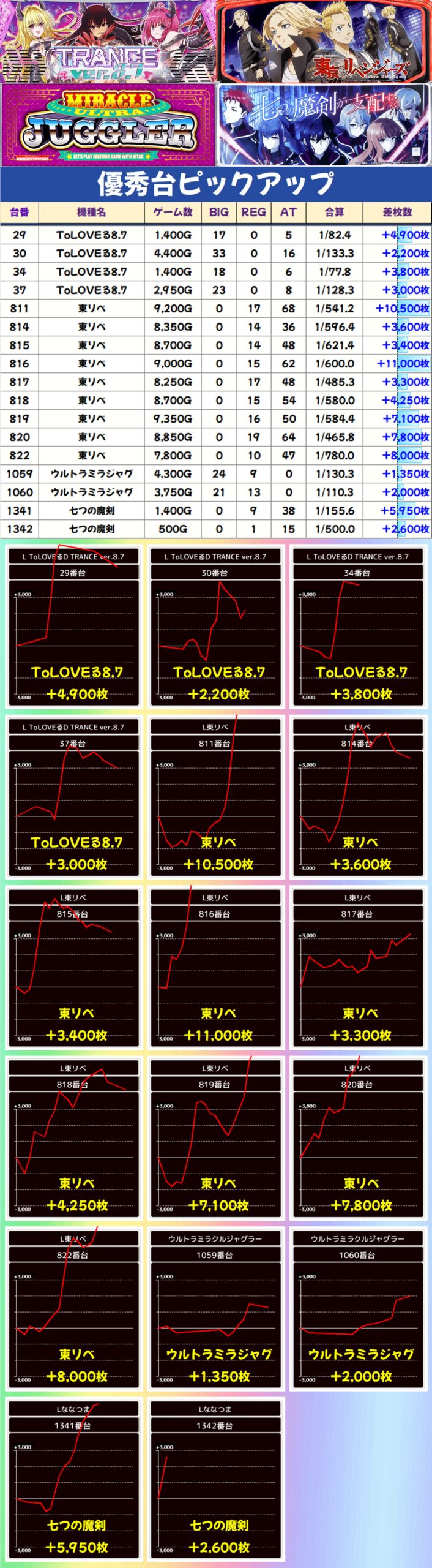 東リベは+11000枚、+10500枚と万枚オーバーが2台出現し、+3000枚超の大量出玉を9台確認することができました。