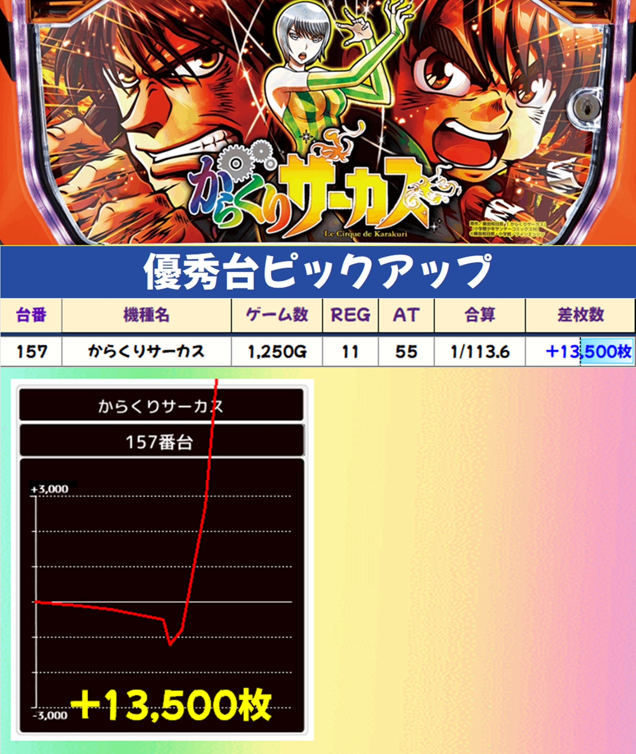 からくりサーカスは残念ながら不発気味でしたが、1台が爆発!+13500枚の大量出玉が出現しました!