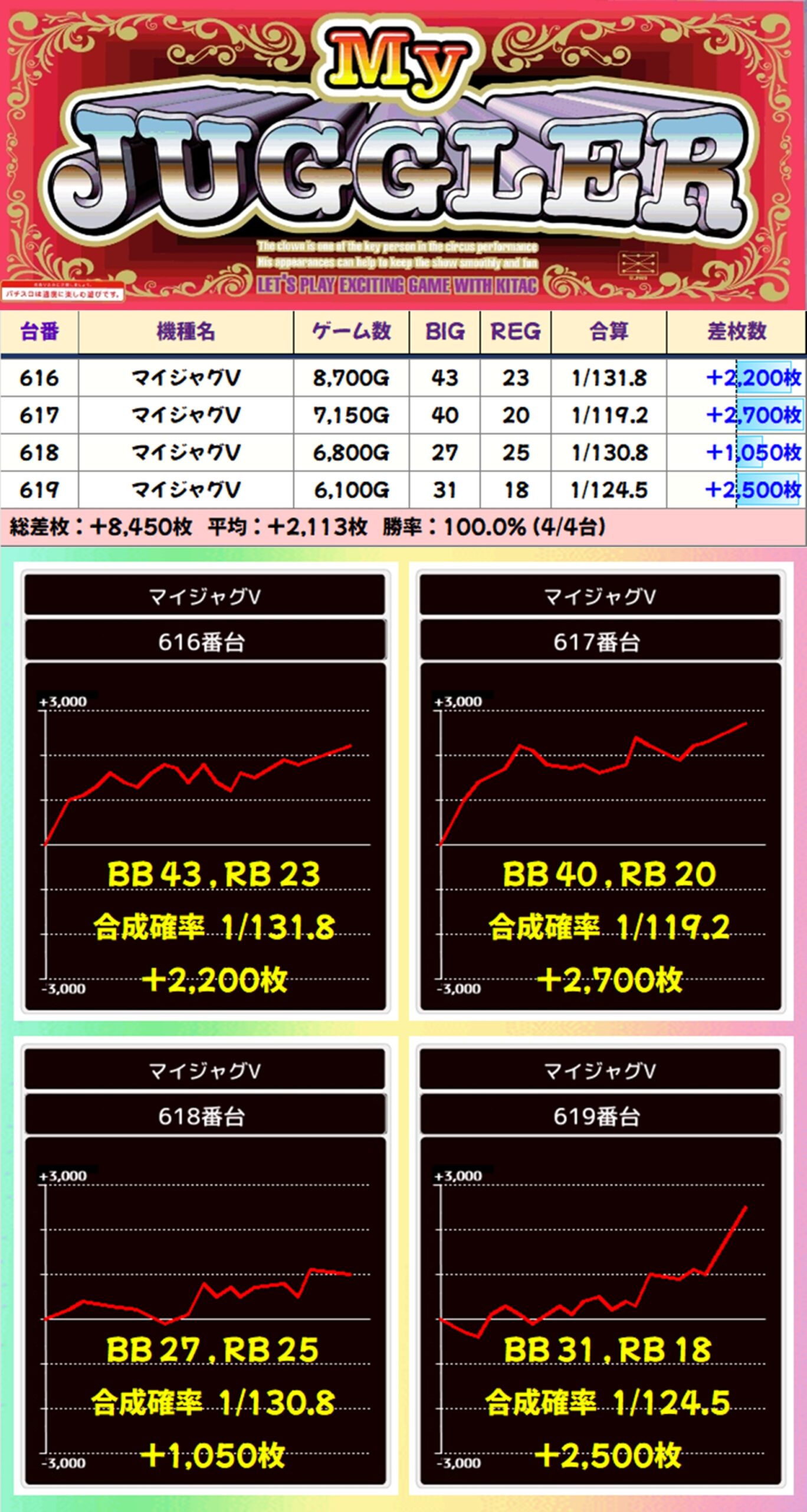【4台並び】マイジャグV(616-619番台)→平均+2,113枚