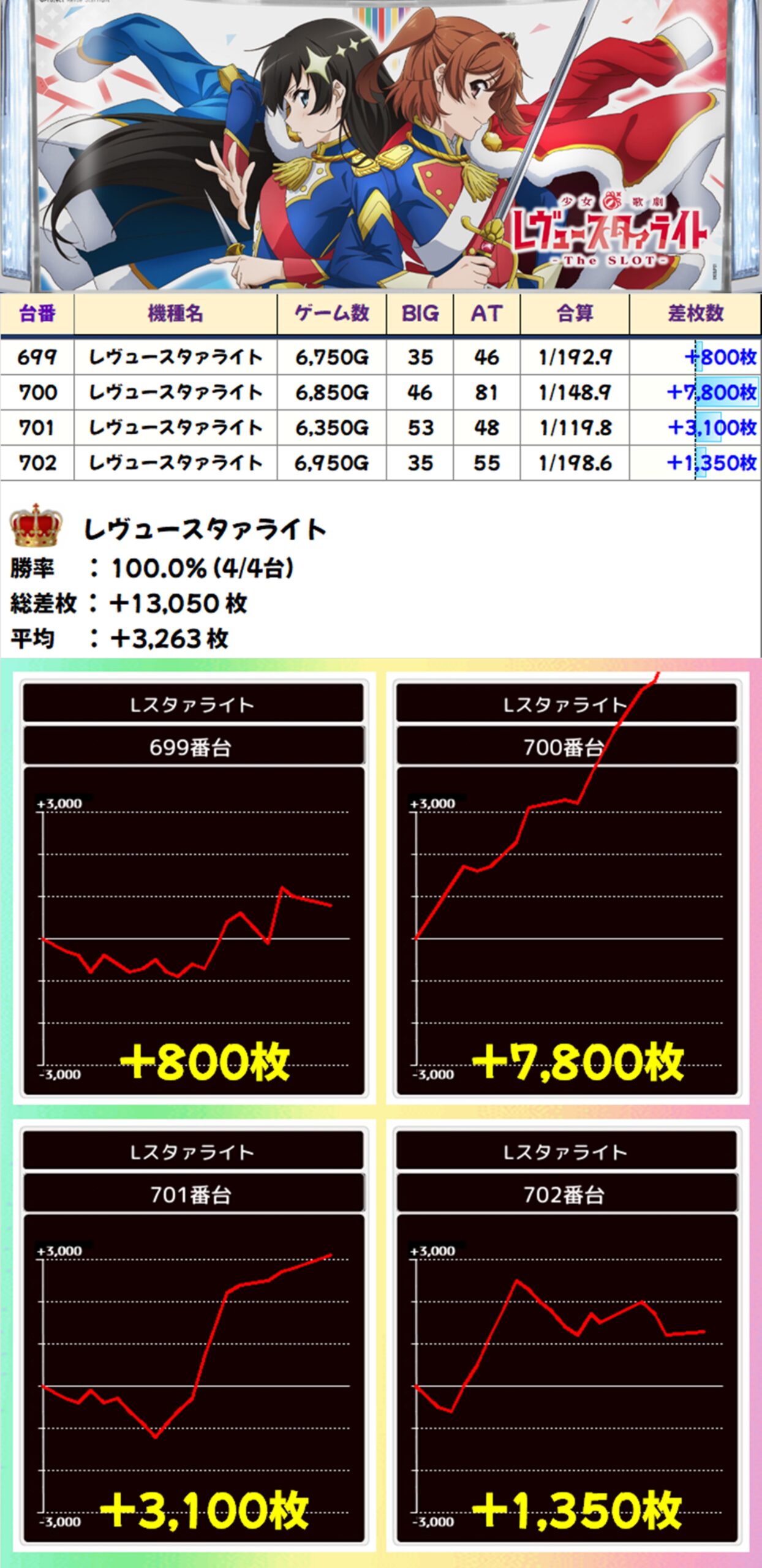 かぶぱポストにヒントがあったレビュースタァライトは全台がプラスに。+7800枚の爆発も確認できました。
