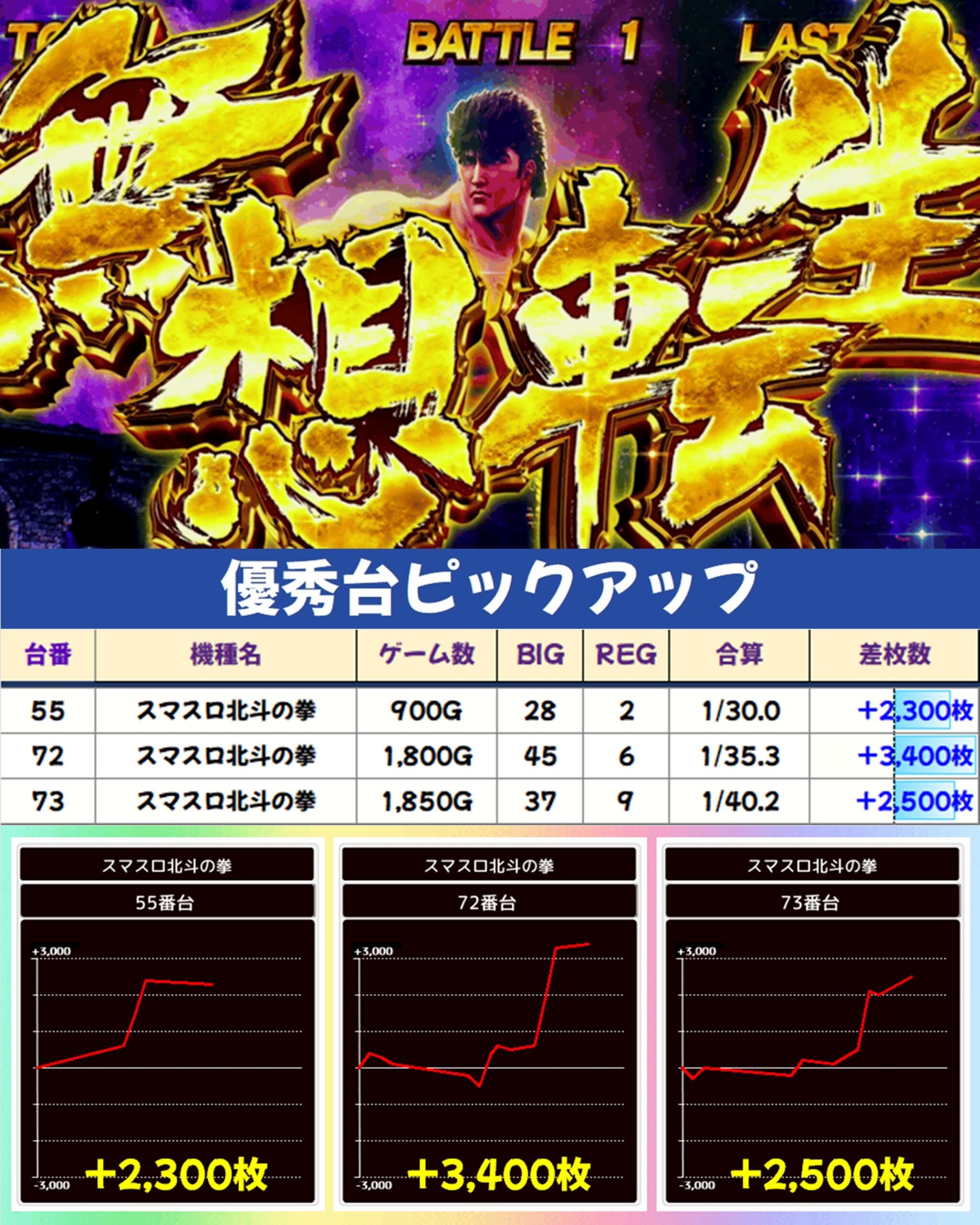 今回はスマスロ北斗の拳に並びの仕掛けがありましたが、それらも含めて優秀台(+2000枚以上)をピックアップしていきます!