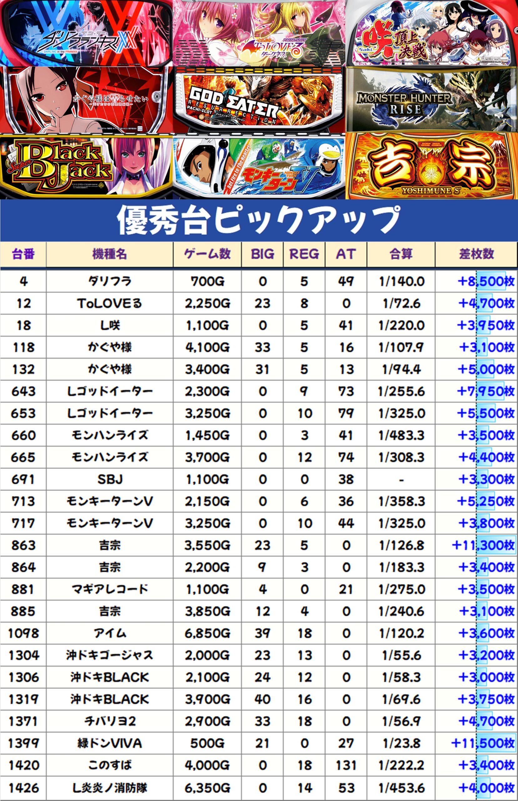各機種の優秀台をピックアップしますので、データをチェックしていきましょう!