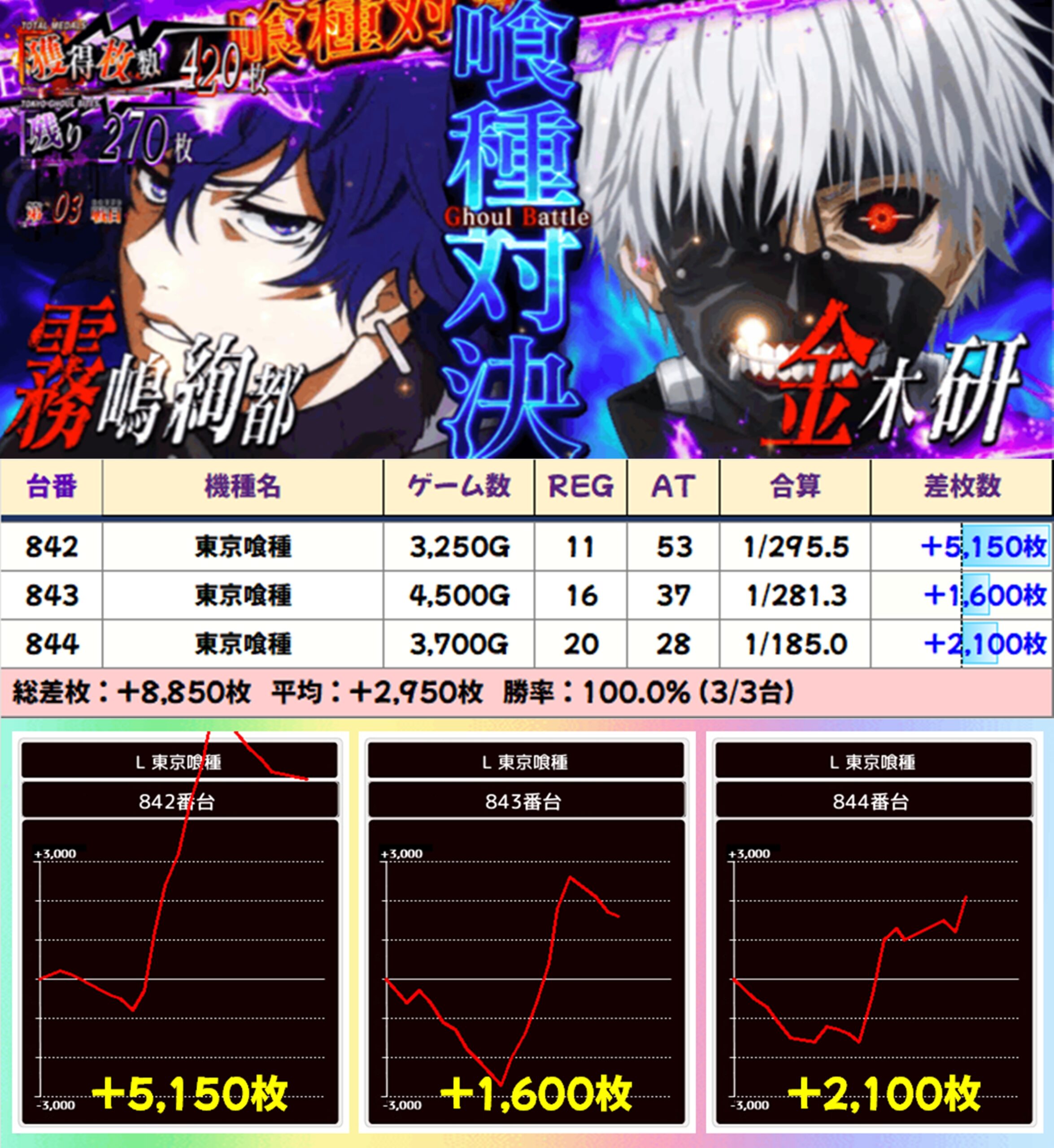 【3台並び】東京喰種(842-844番台)→平均+2,950枚