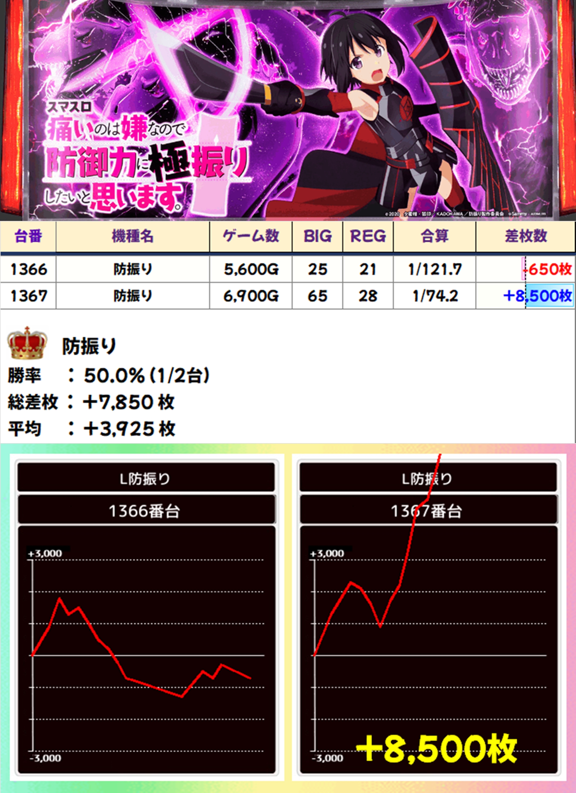 同じくかぶぱポストにヒントがあった防振りも全台系濃厚で、こちらからは+8500枚の大量出玉が出現。なお、防振りは3台の設置がありますが、1台は稼働停止中となっていたので、除外しております。