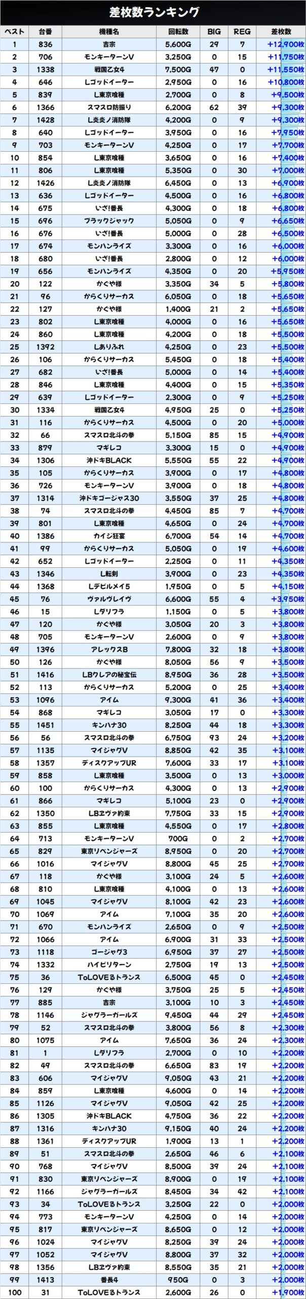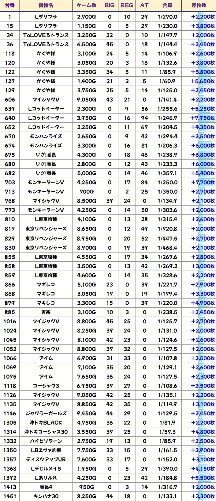 各機種の優秀台をピックアップしますので、データをチェックして明日以降の立ち回りの参考にしてください!