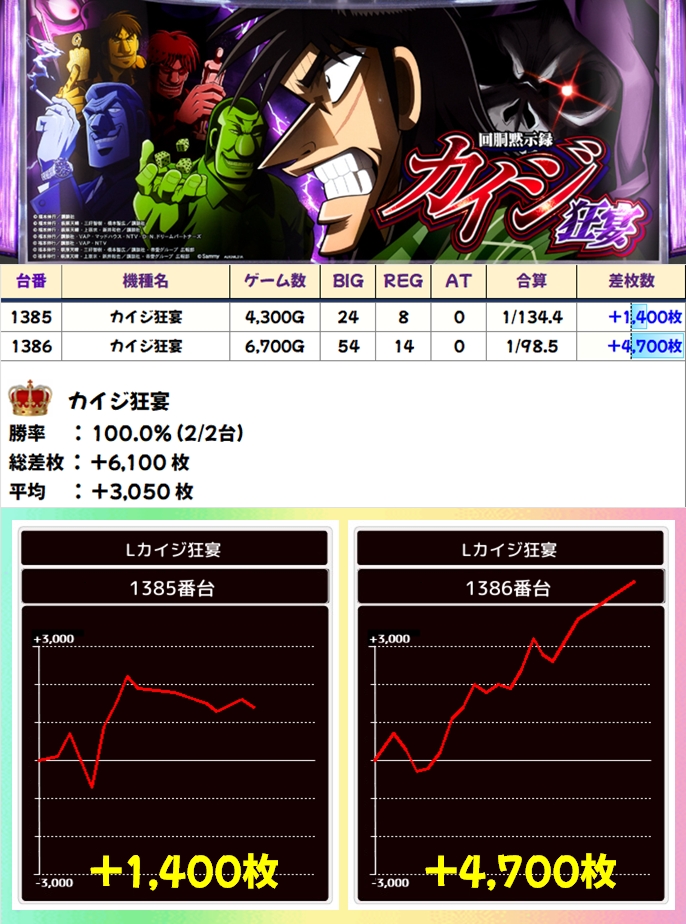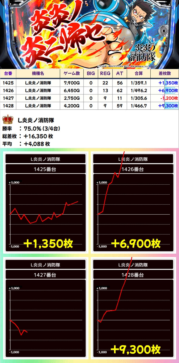 この日はかぶぱポストで示唆されていた「カイジ狂宴」の他に、「L炎炎ノ消防隊」が全台系濃厚の結果になっており、機種全体で平均+4000枚超と大量出玉を記録!