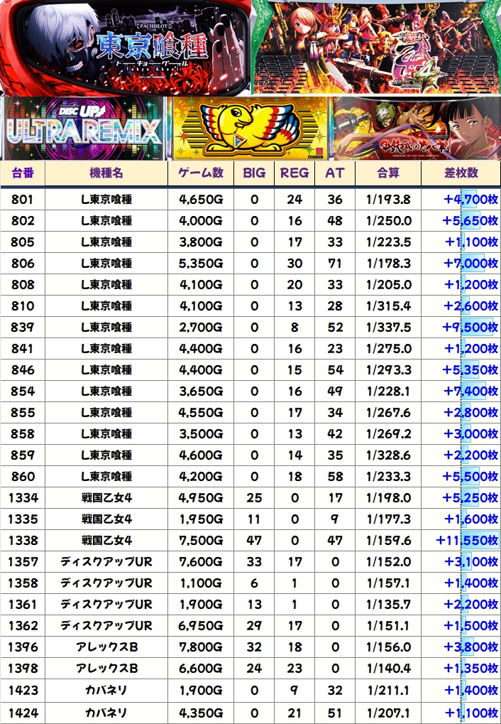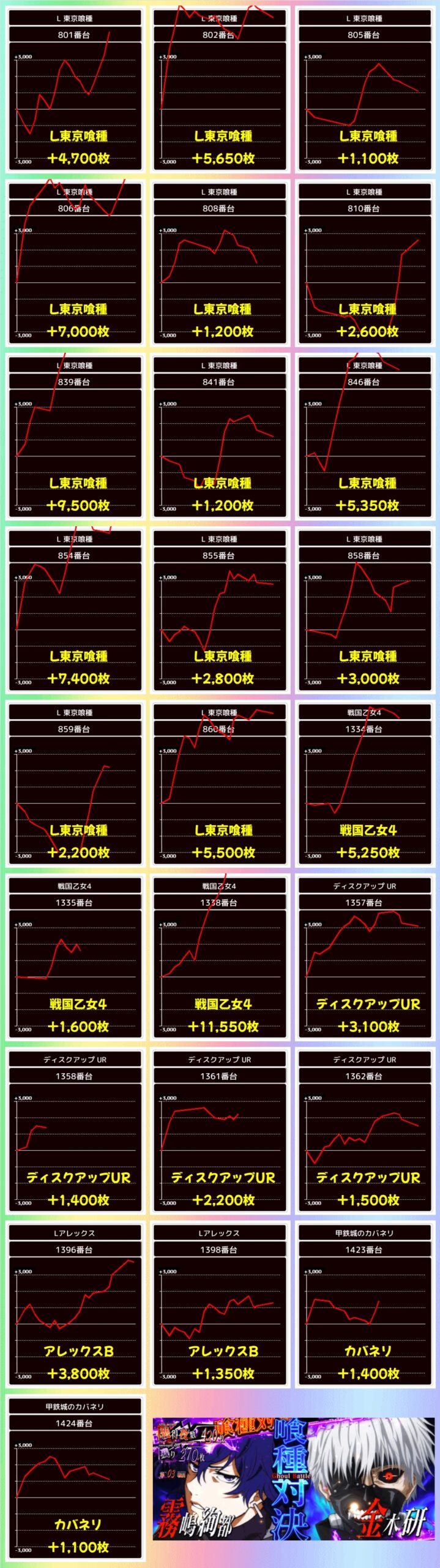 その他にも準新台の「東京喰種」からも+9500枚の万枚クラスの爆出し台を確認することができました。