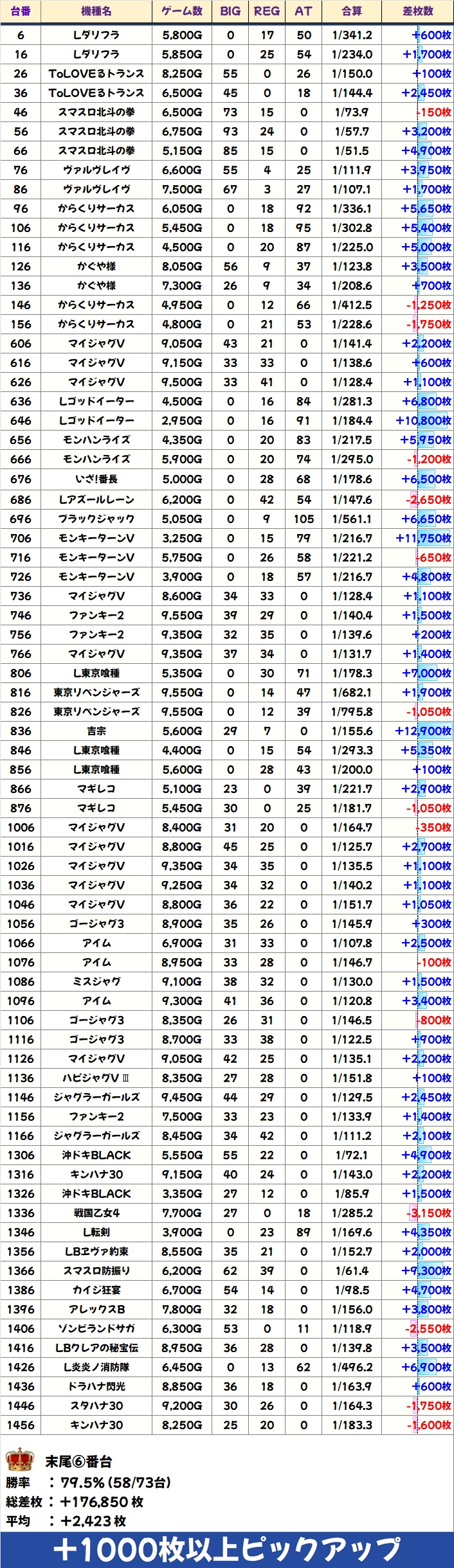 【末尾仕掛け】末尾⑥番台(58/73台+)→平均+2,423枚