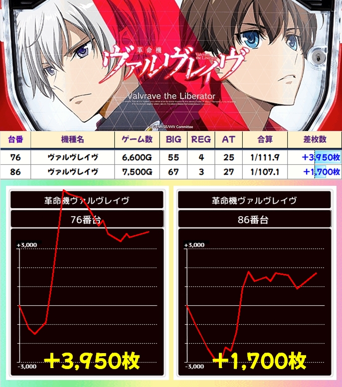 「ヴァルヴレイヴ」は+2000枚以上の優秀台が1台のみと不発気味の結果になっていましたが、末尾⑥番台がどちらもプラス差枚としっかり結果を残していました!
