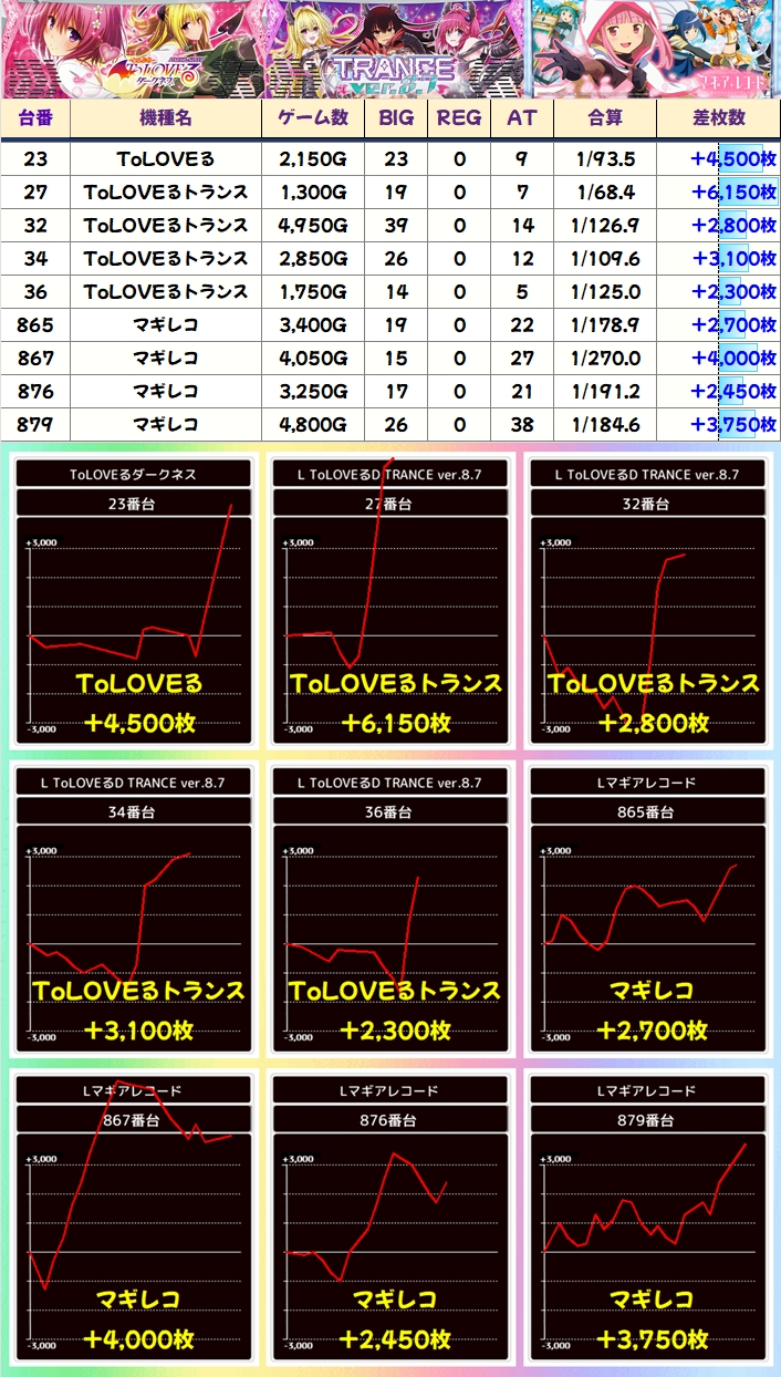 今回は先述した通り9の日機種の「ToLOVEる」と「ToLOVEるトランス」が1/2系濃厚の結果になっていましたが、その他の9の日機種である「マギレコ」からも優秀台を複数確認!