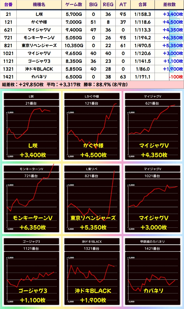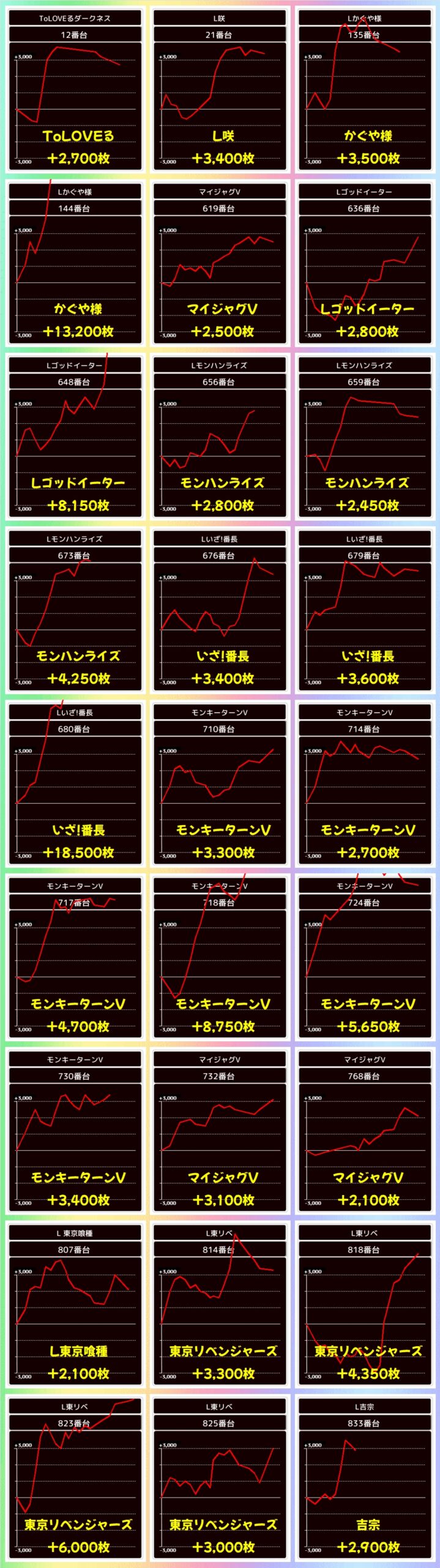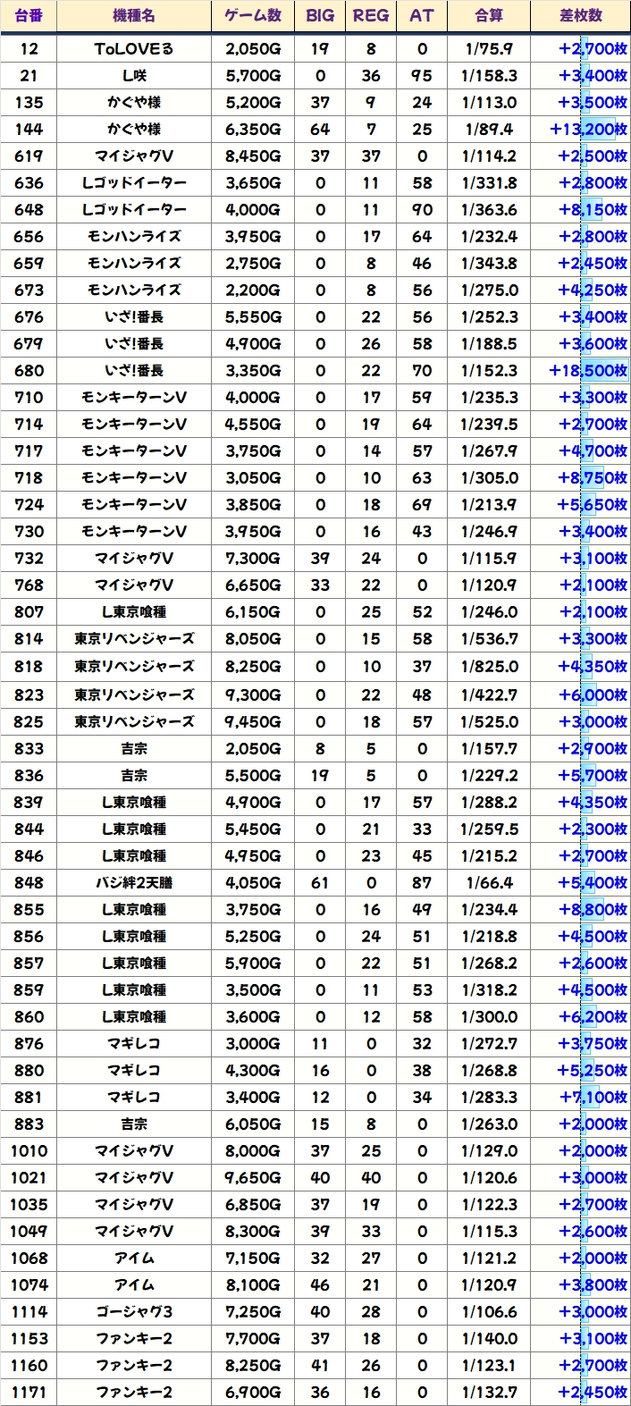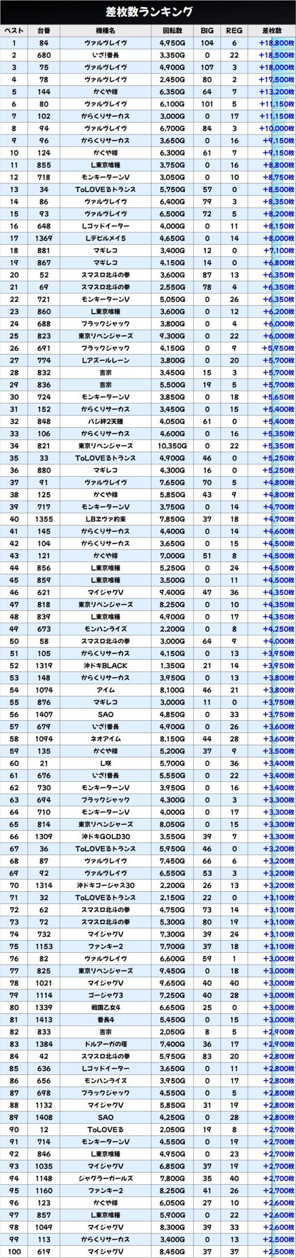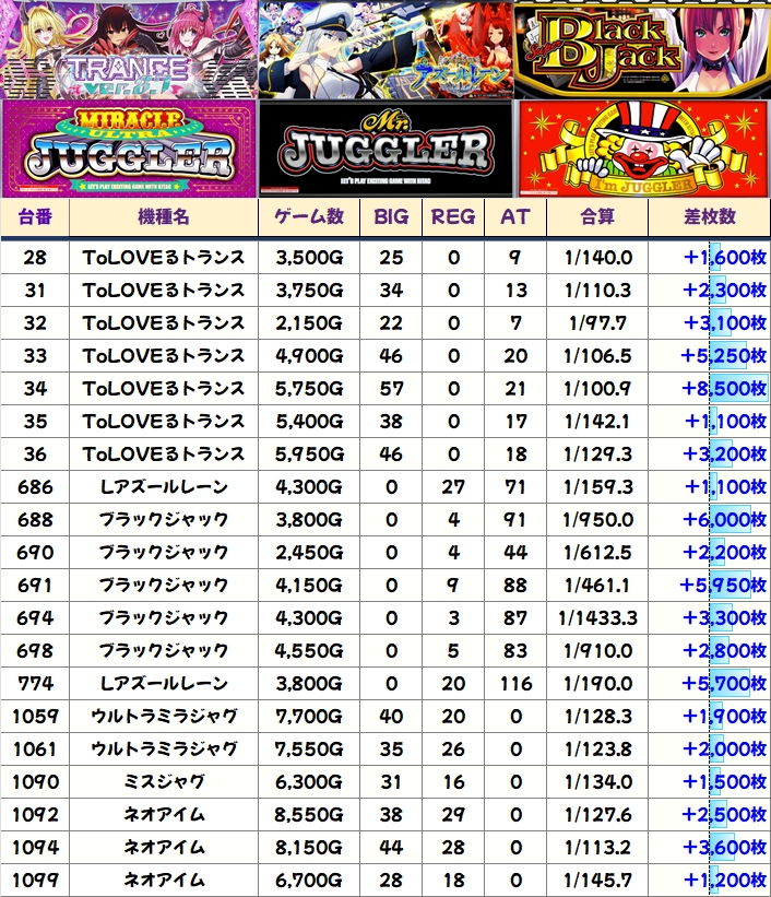 今回も各機種の優秀台(+2000枚以上)をピックアップしていきますので、データをチェックして明日以降の参考にしてください!