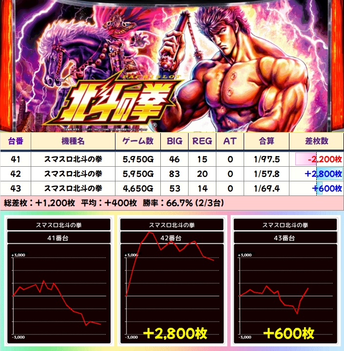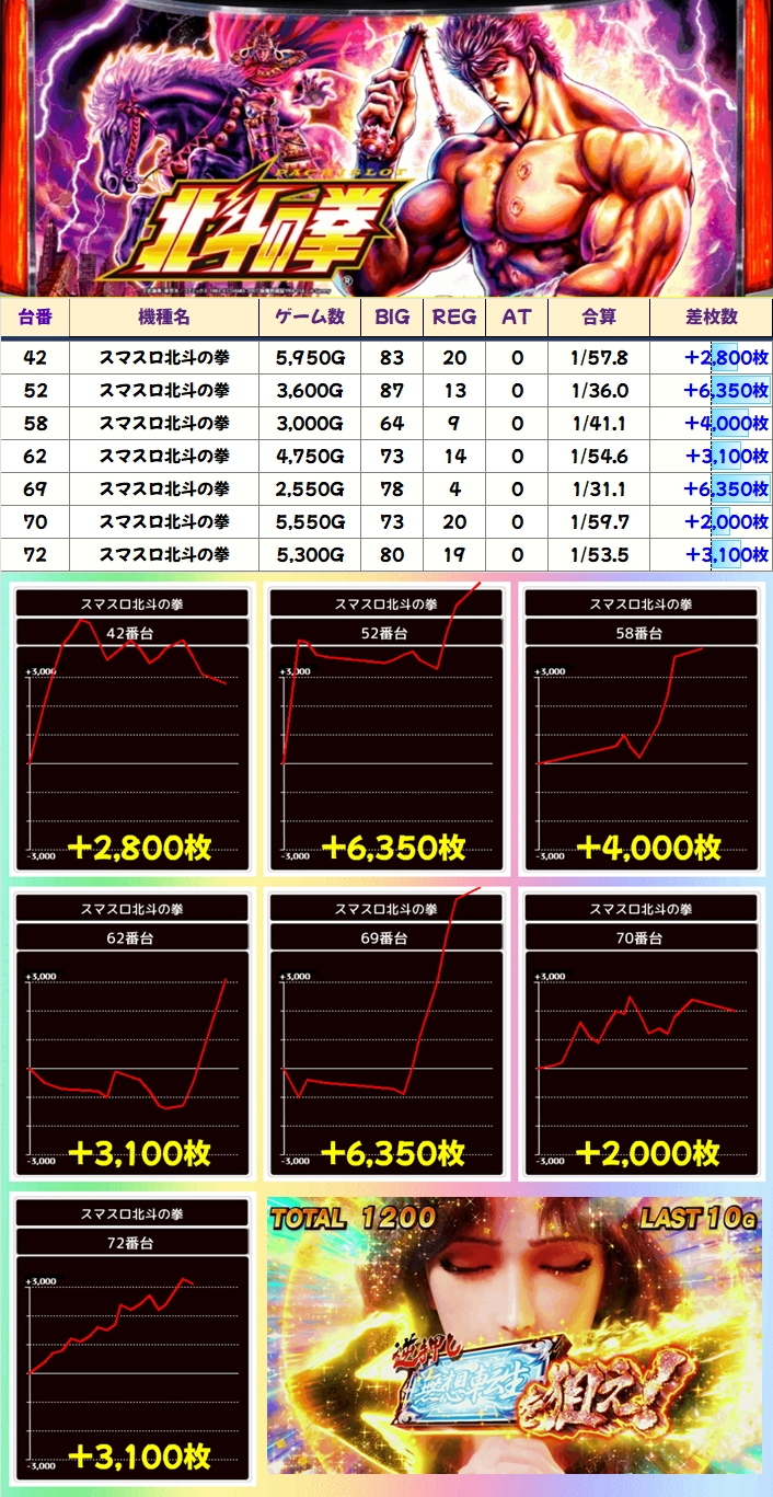 「スマスロ北斗」からは+2000枚以上の台を複数確認! +6000枚以上の大量出玉も2台出現していました!