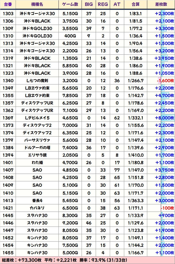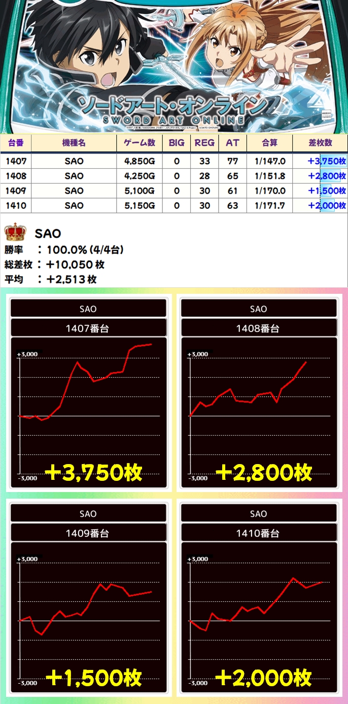また、激熱7days対象フロアの4Fからは「SAO」が全台系の対象になっていたようで、こちらは全台プラスと素晴らしい結果に!