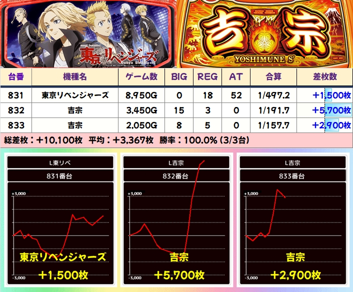 多台数機種から少台数機種まで幅広い機種に単品を用意していたようで、最新台の「東京リベンジャーズ」からも優秀台を複数確認することができました。