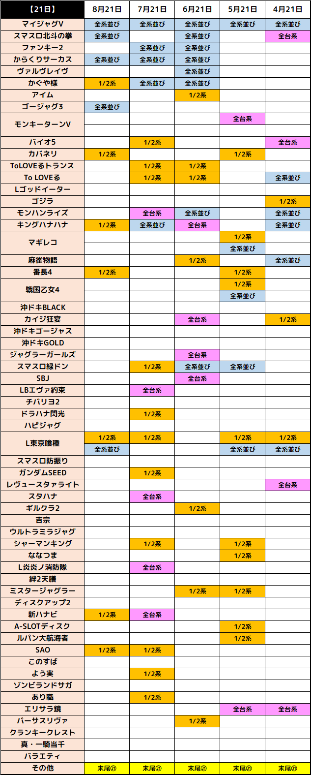 毎月21日は高確率で全台系濃厚機種が出現し、今回のようなド派手な全台系が用意されることも珍しくないため、来月も全台系を意識した立ち回りが重要になりそうですね。