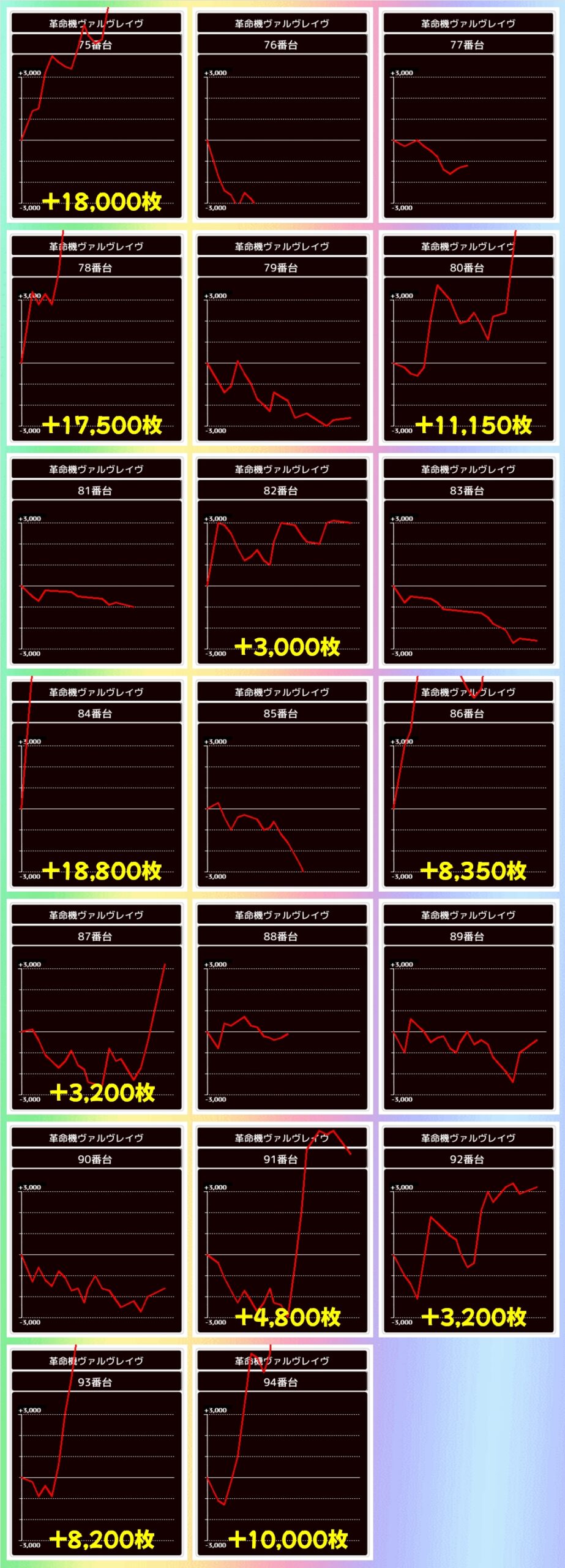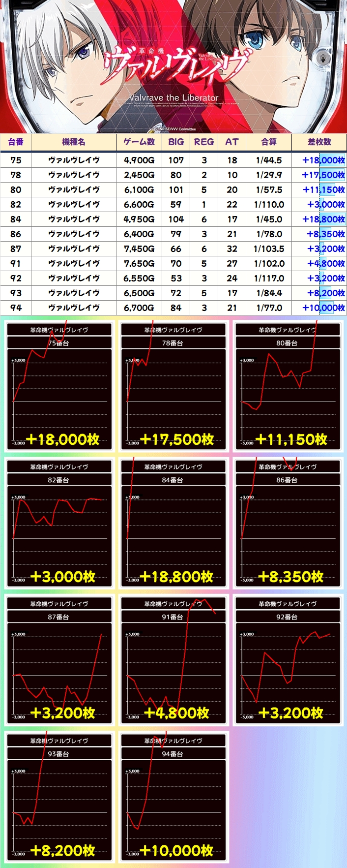 この日は毎日オススメ機種の「ヴァルヴレイヴ」が全台系濃厚の結果になっており、万枚オーバーが5台と大爆発!