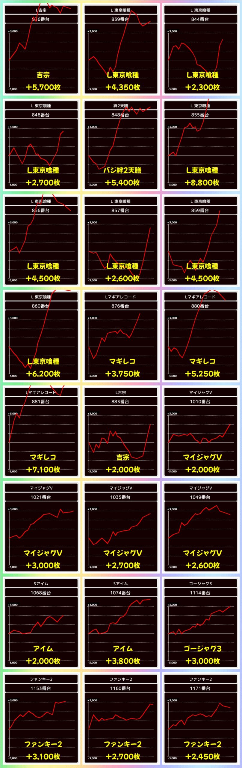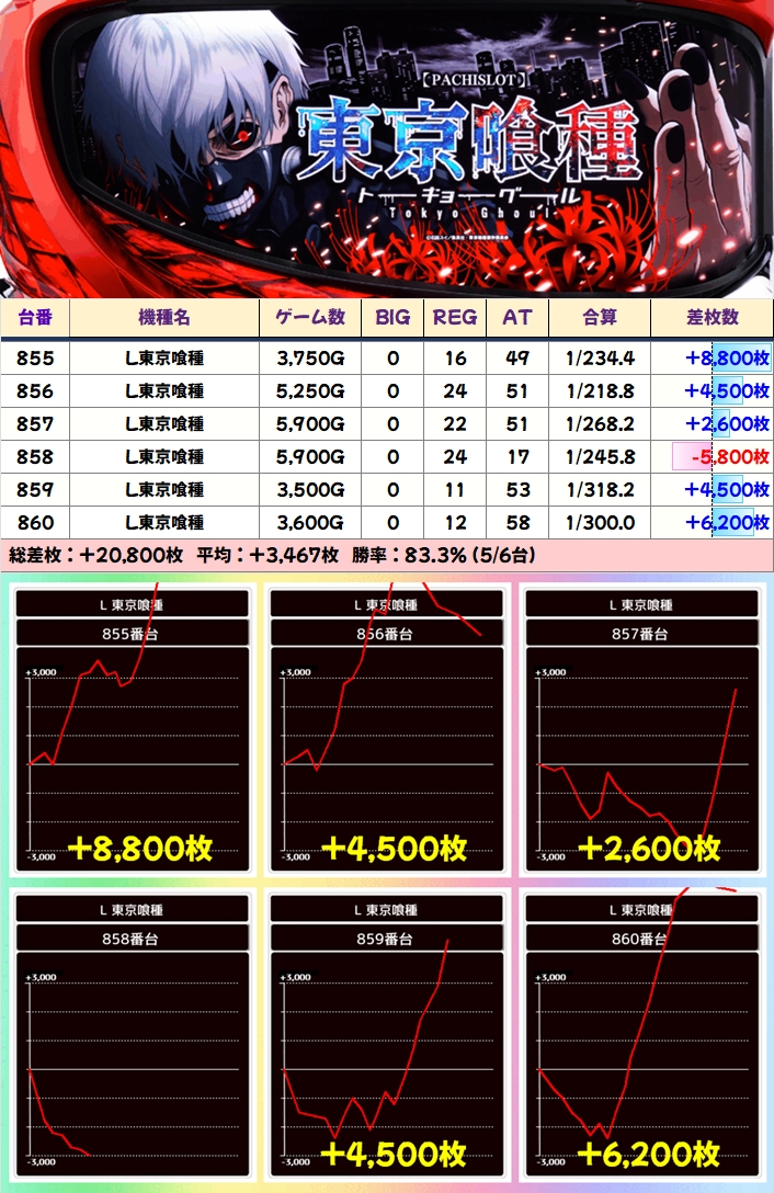 また、今回は列仕掛けも確認でき、「東京喰種」の6台列が平均+3467枚、勝率83%(5/6台)と優秀な結果を残していました。