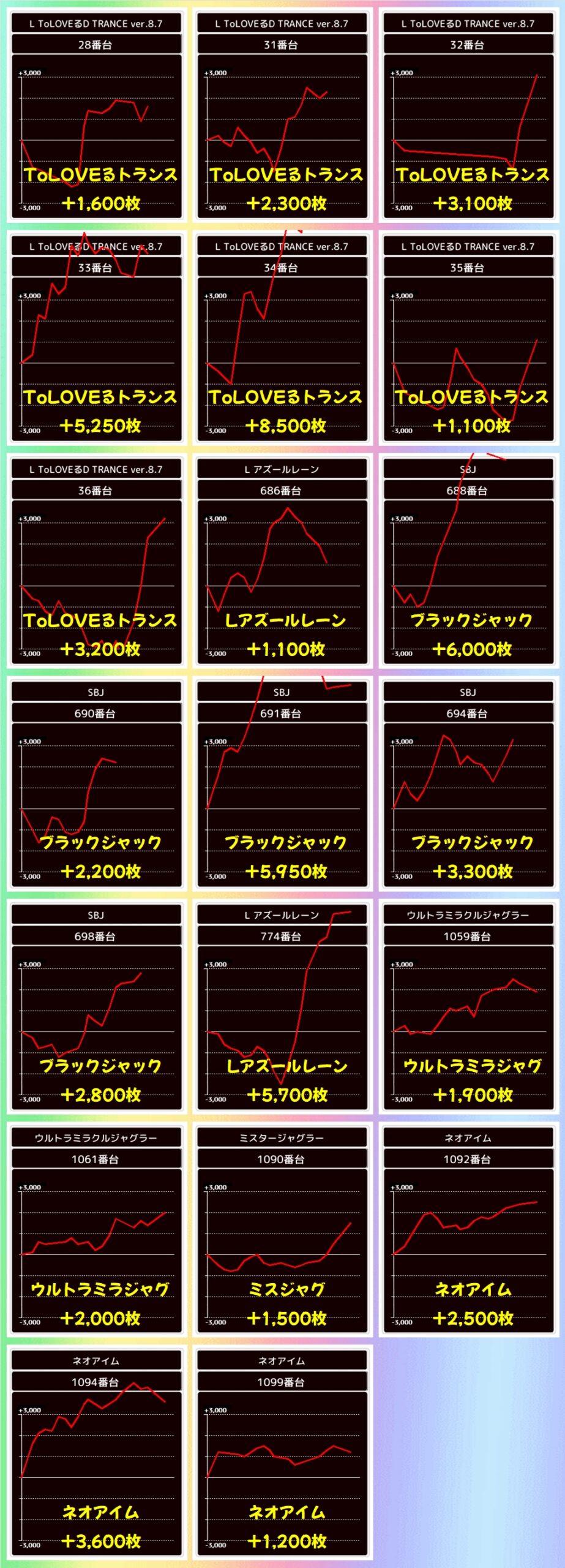 上記の機種からは大量出玉も確認することができ、「ToLOVEるトランス」「アズールレーン」「ブラックジャック」からは+5000枚以上の爆出し台が出現していましたよ!