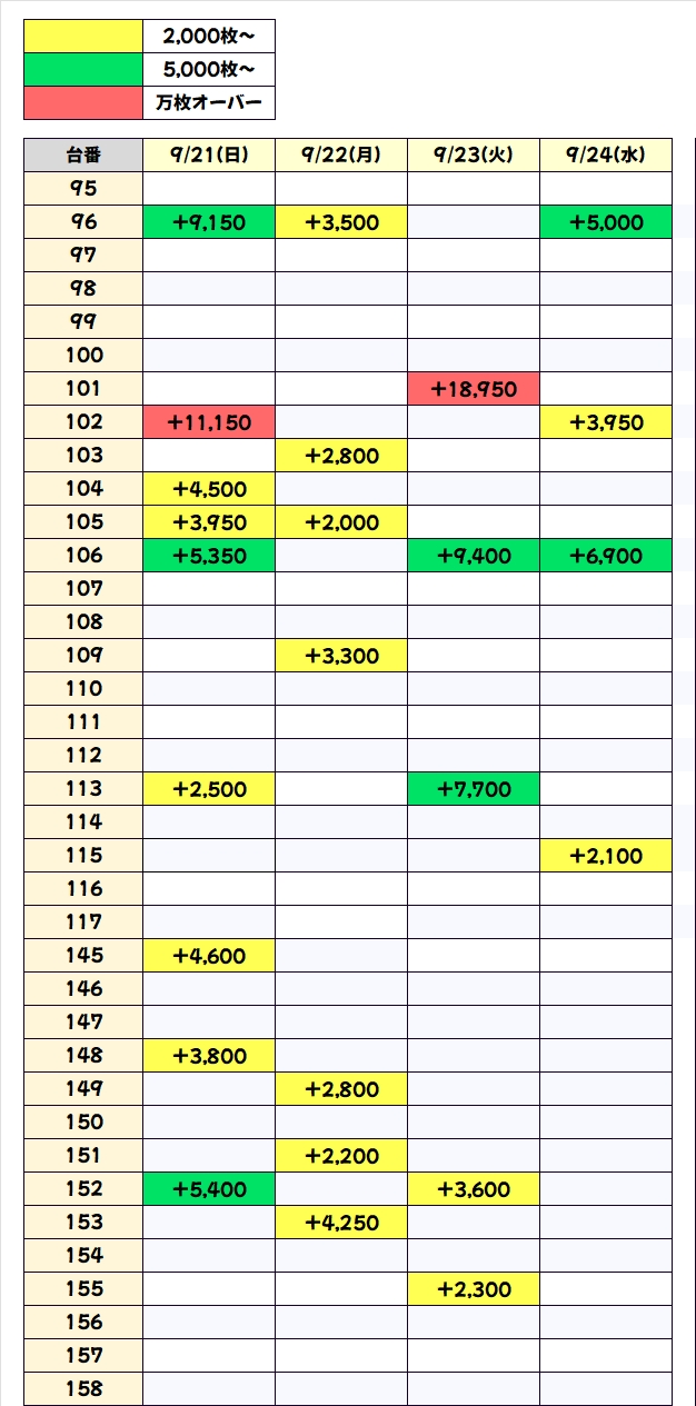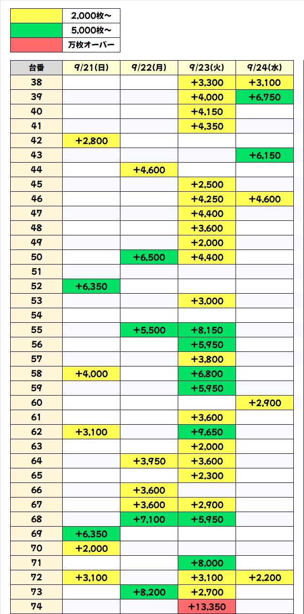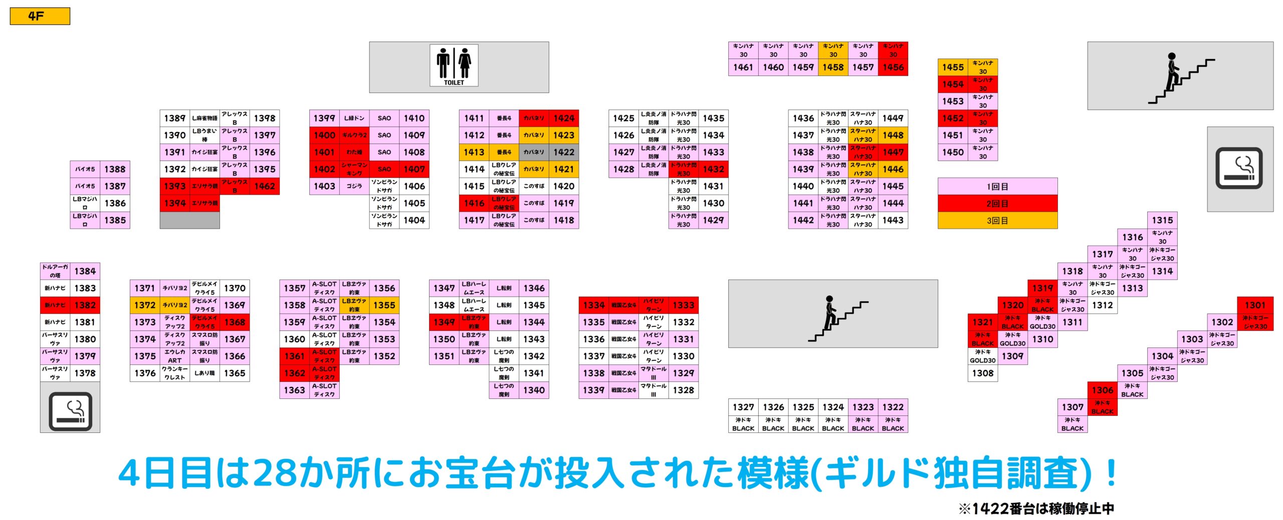 過去の傾向として27日までは対象フロアでのお宝台の大量投入に期待できますので、明日以降は積極的に4Fフロアを狙ってみるのも一つの手段と言えますね。