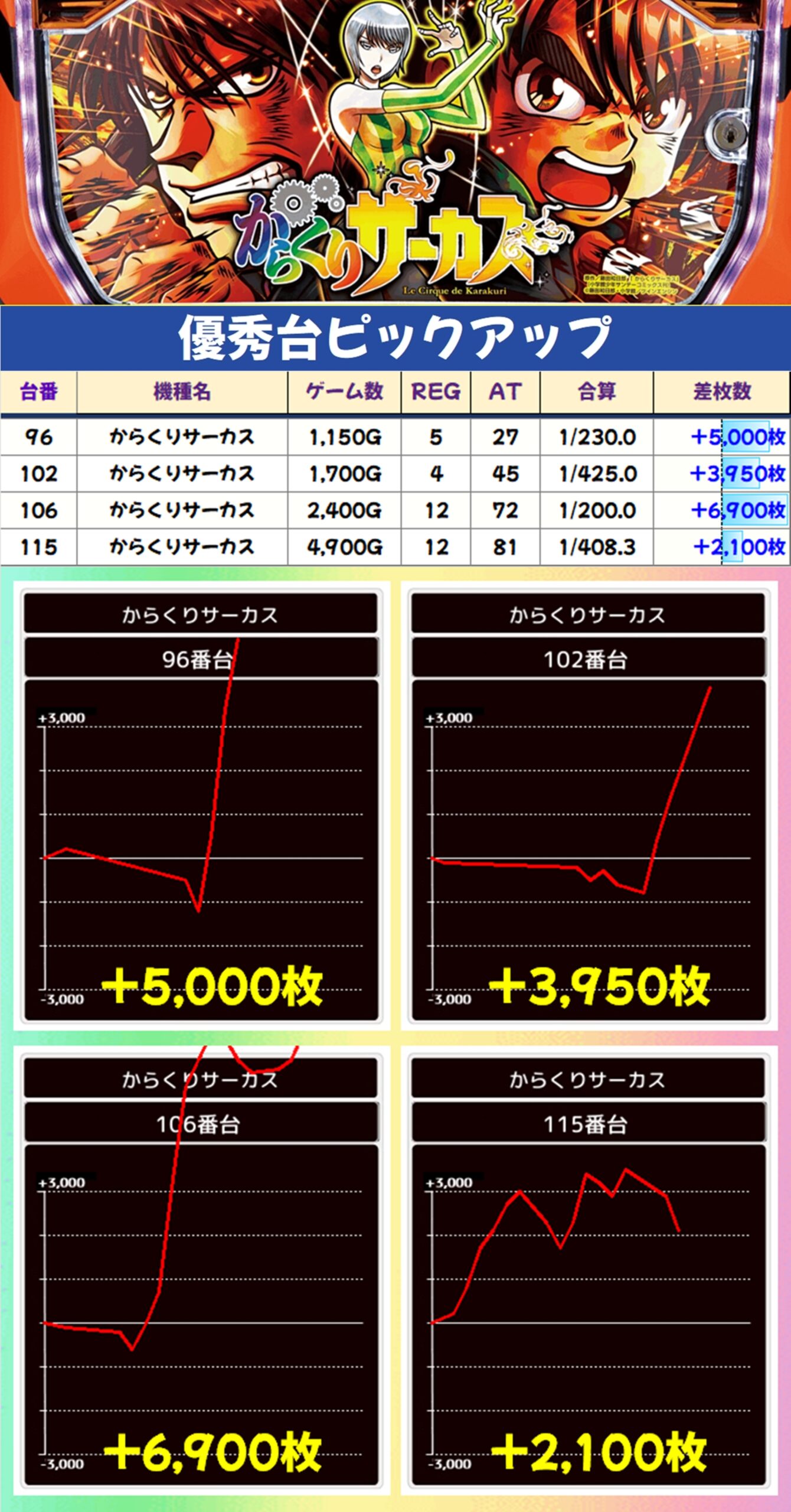 からくりサーカスからは+6900枚や+5000枚の大量出玉を確認!