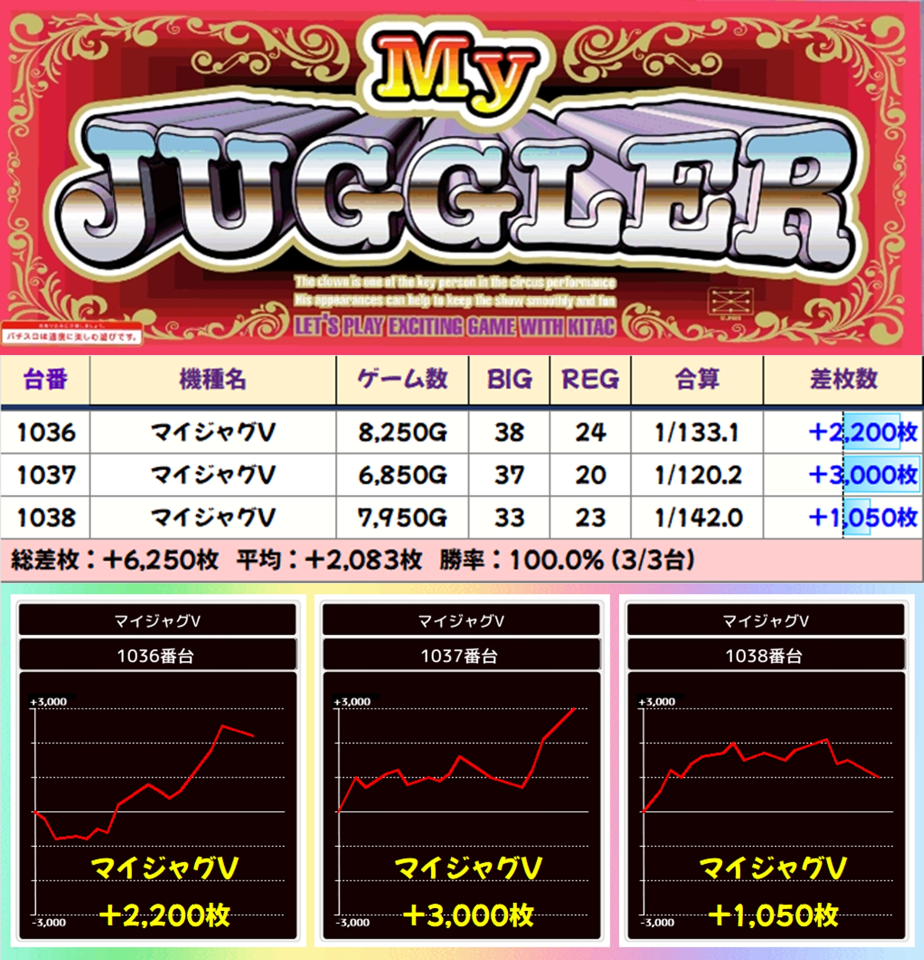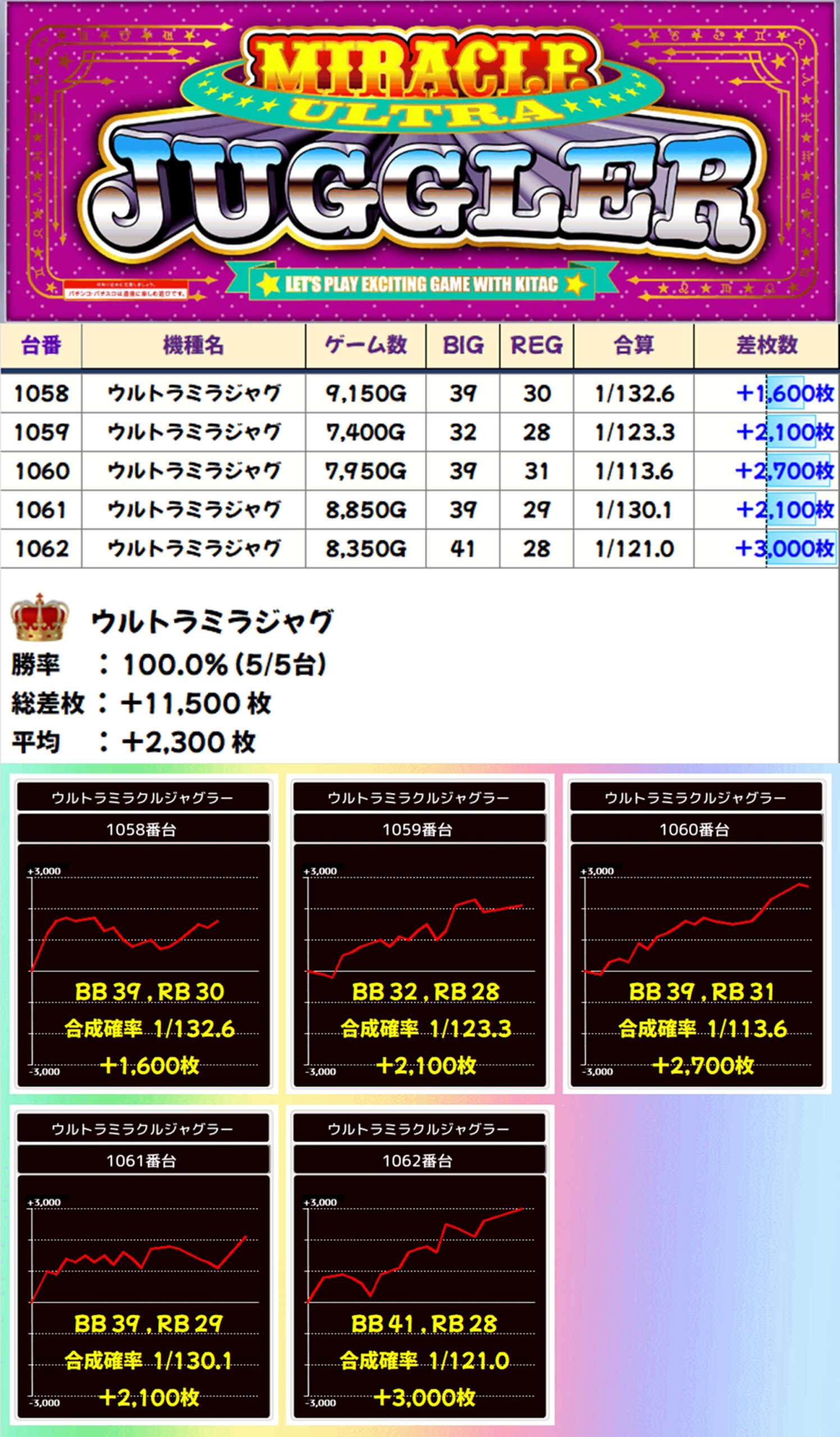 ウルトラミラジャグは全台がプラスとなっただけでなく、いずれの台も優秀な出玉を獲得。+3000枚の出玉も確認できました。