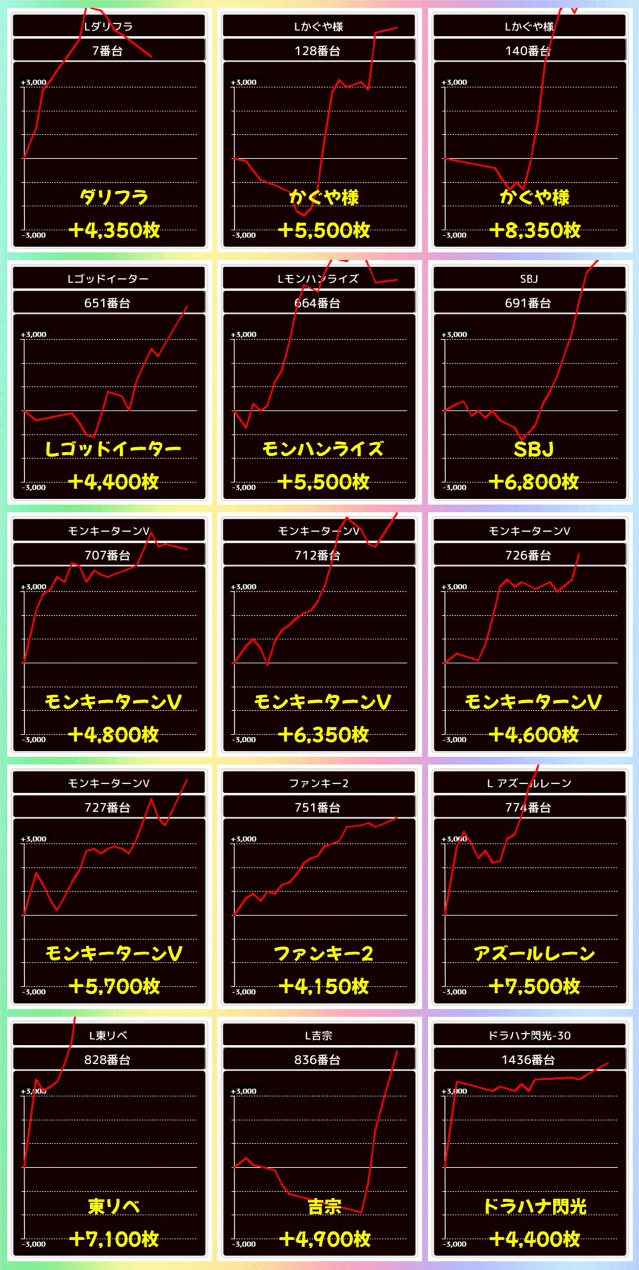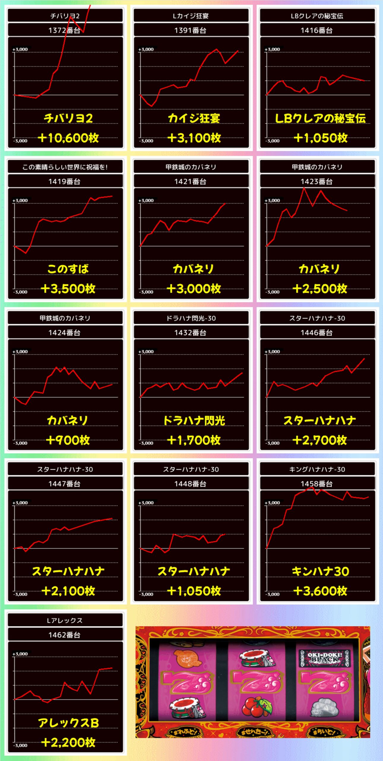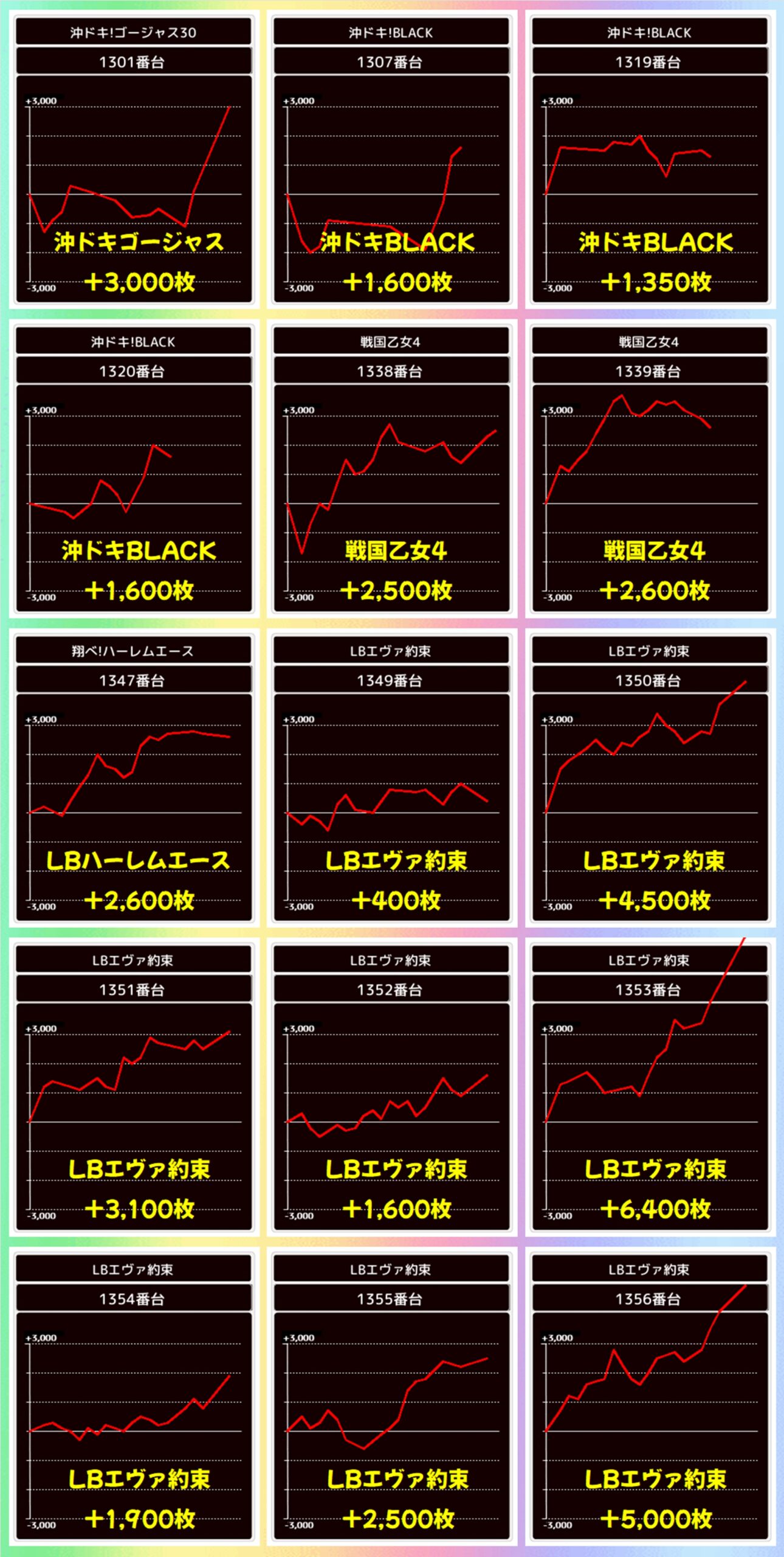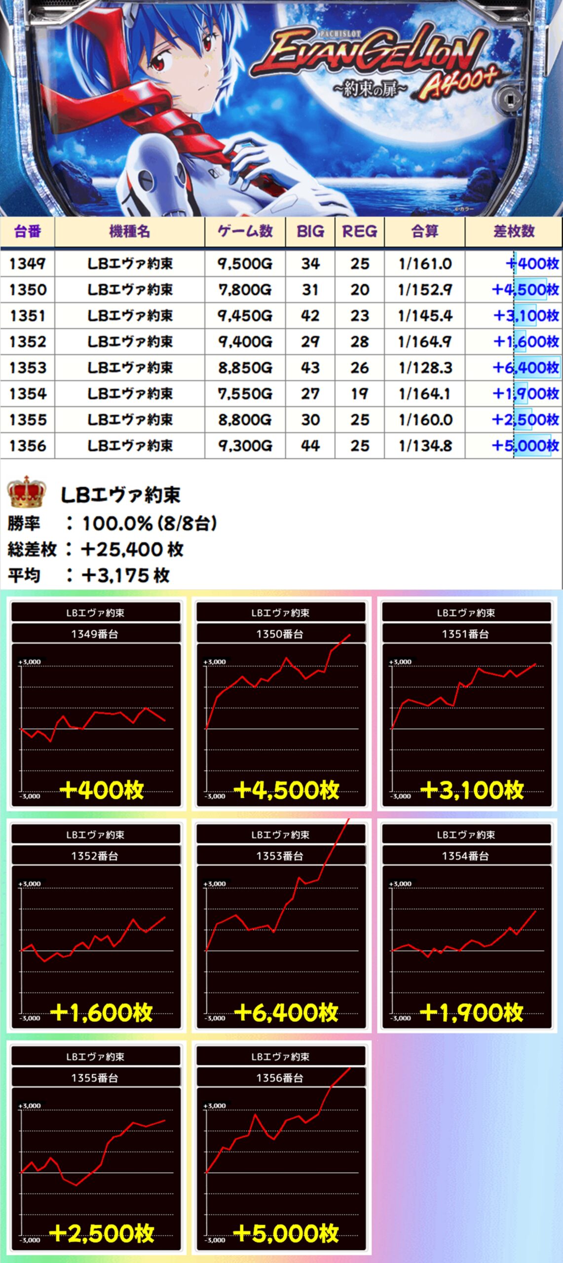 かぶぱポストにヒントがあったLBエヴァ約束は全台がプラスに。出玉が伸び悩んだ台もありましたが、+6400枚や+5000枚などの大量出玉も確認できました!