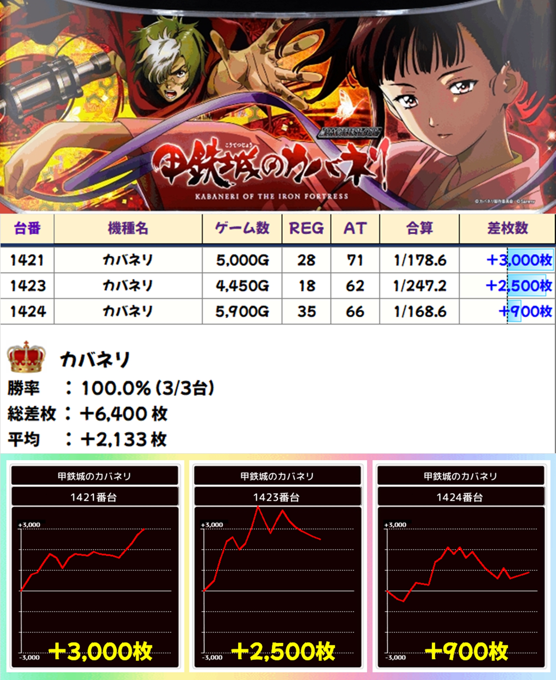 カバネリからは+3000枚や+2500枚の出玉を確認。なお、カバネリは4台の設置がありますが、1422番台は稼働停止となっていたため除外しております。