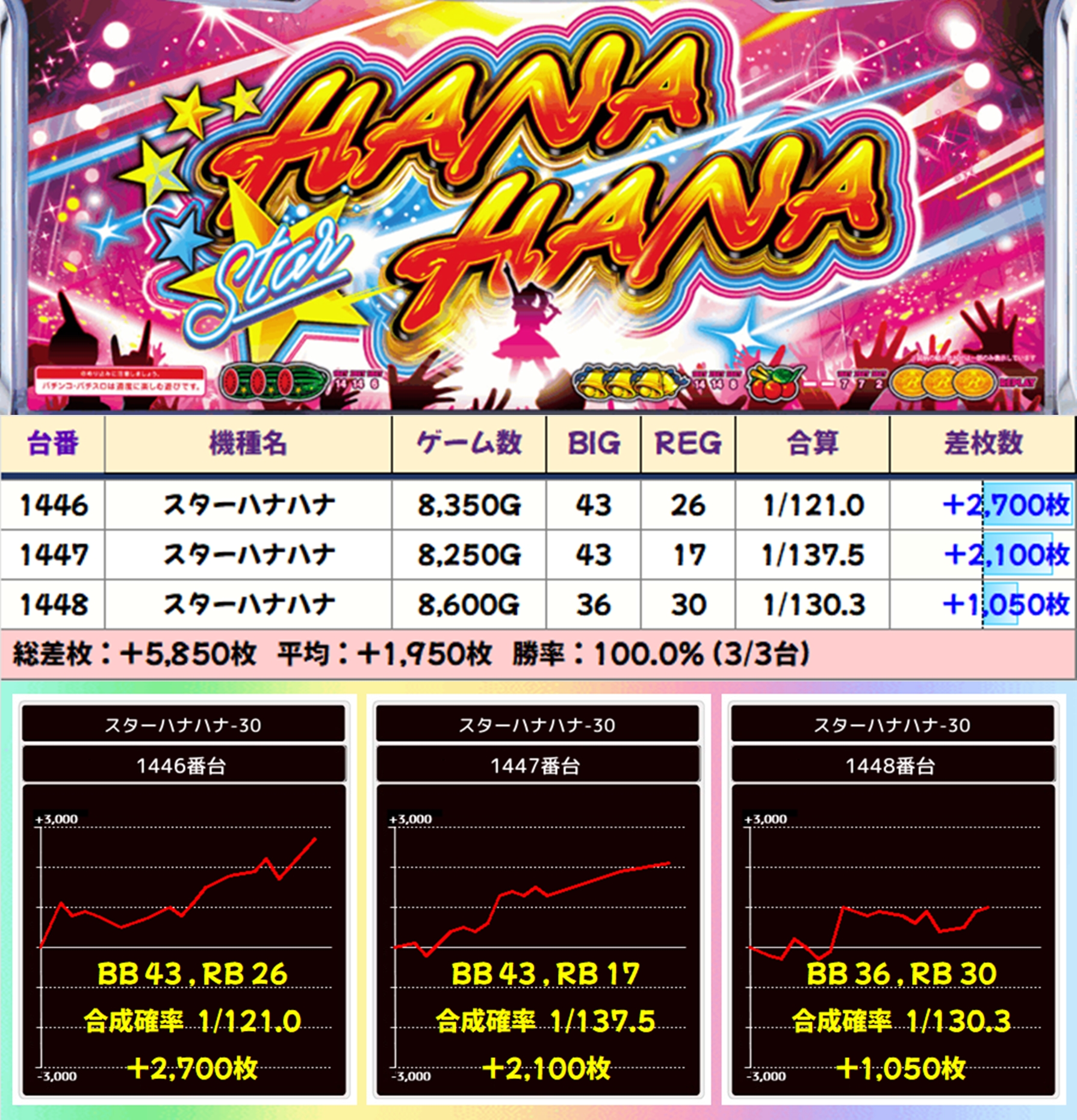 【3台並び】スターハナハナ(1446-1448番台)→平均+1,950枚