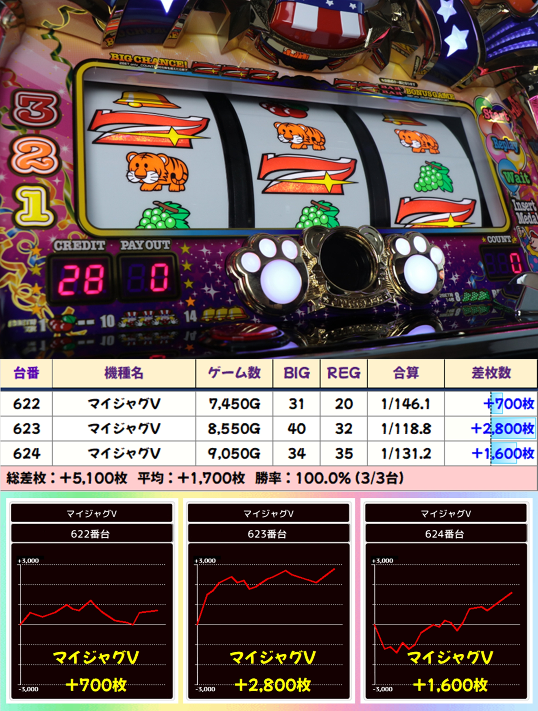 【3台並び】マイジャグV(622-624番台)→平均+1,700枚
