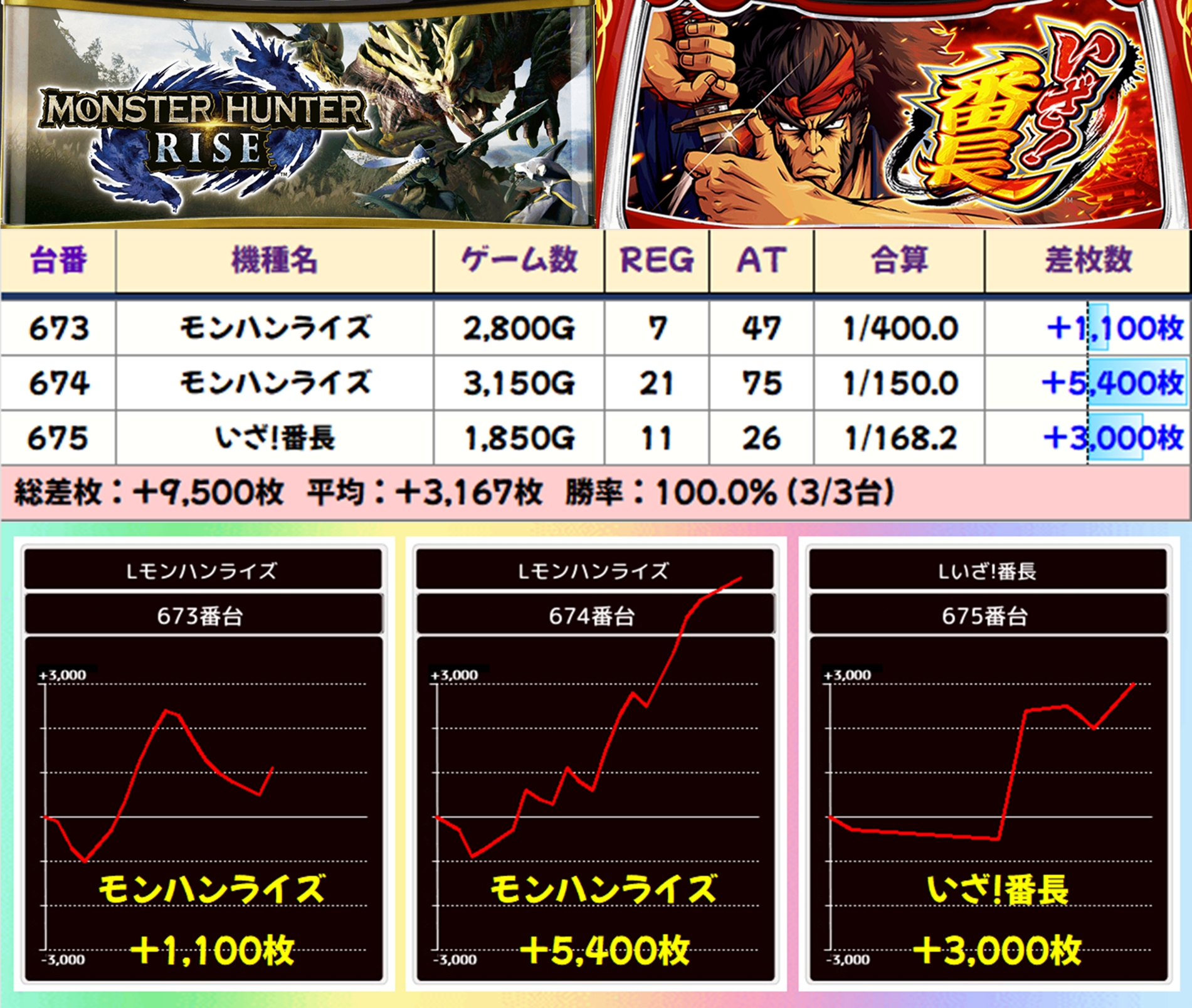 【3台並び】モンハンライズ・いざ!番長(673-675番台)→平均+3,167枚