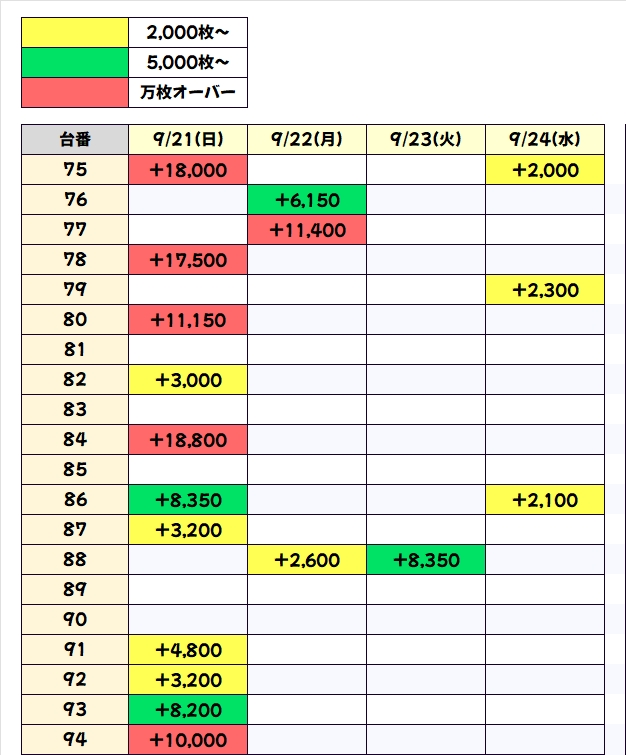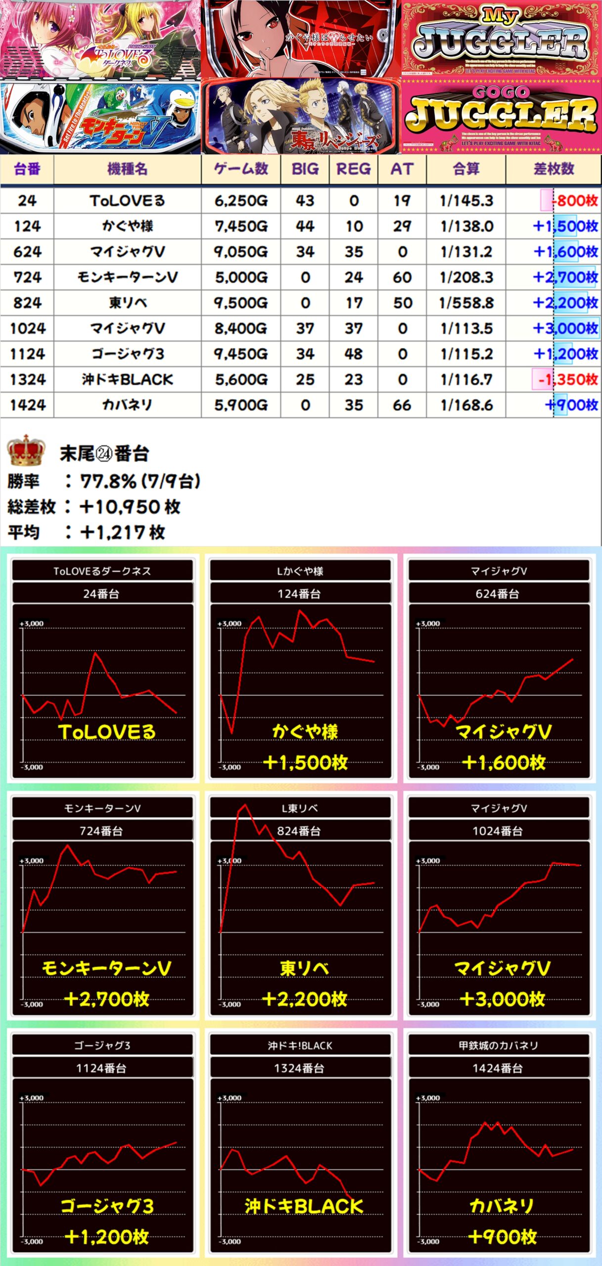 21-27日は日付末尾の仕掛けが恒例となっており、今回の末尾24番台は平均+1217枚という結果に。不発の台もありましたが、9台中7台がプラスで大量出玉も確認することができました!
