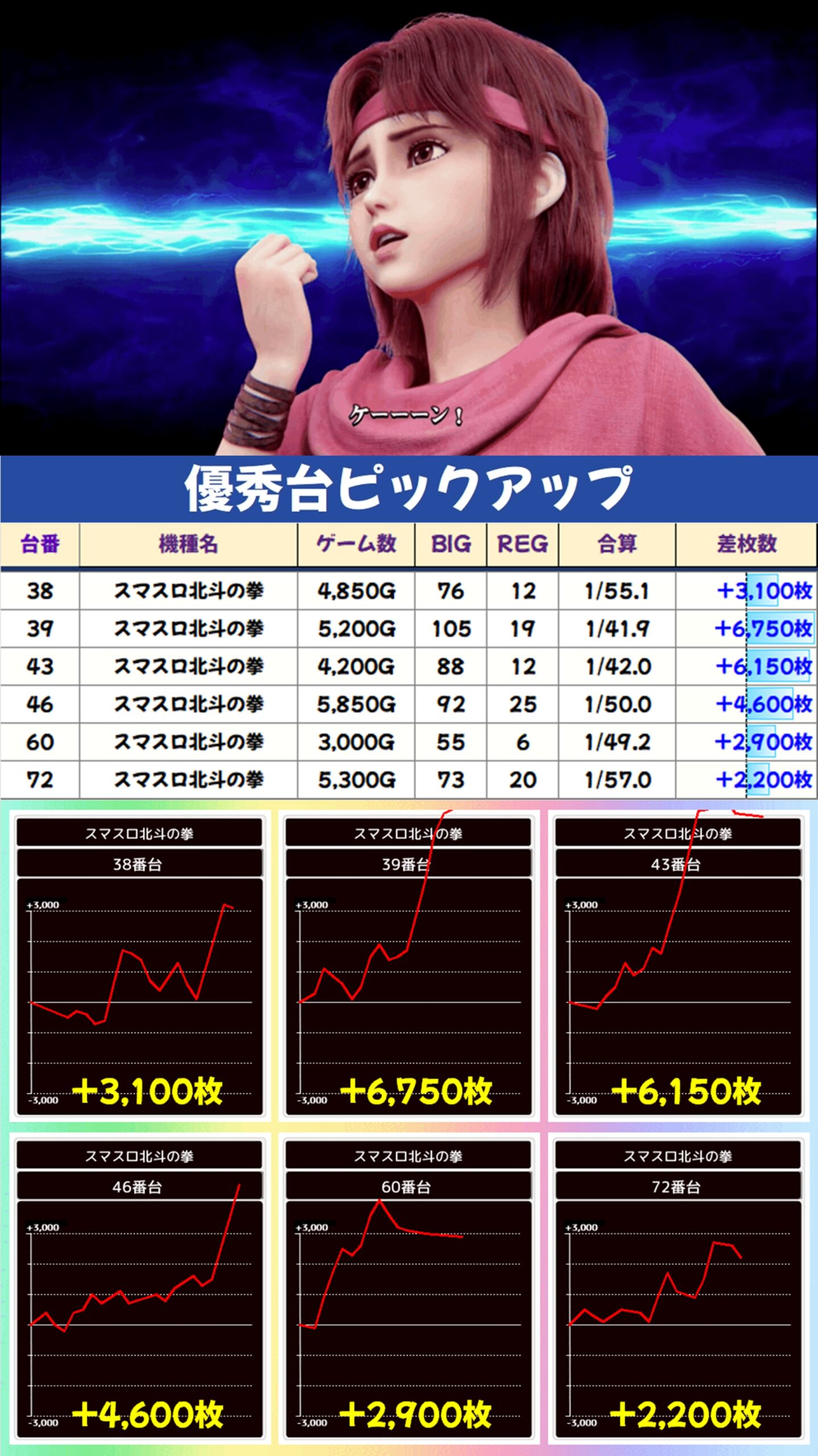 今回はスマスロ北斗の拳に列の仕掛けがありましたが、それらも含めて各機種の優秀台(+2000枚以上)をピックアップしていきます!データをチェックして明日以降の参考にしてください!