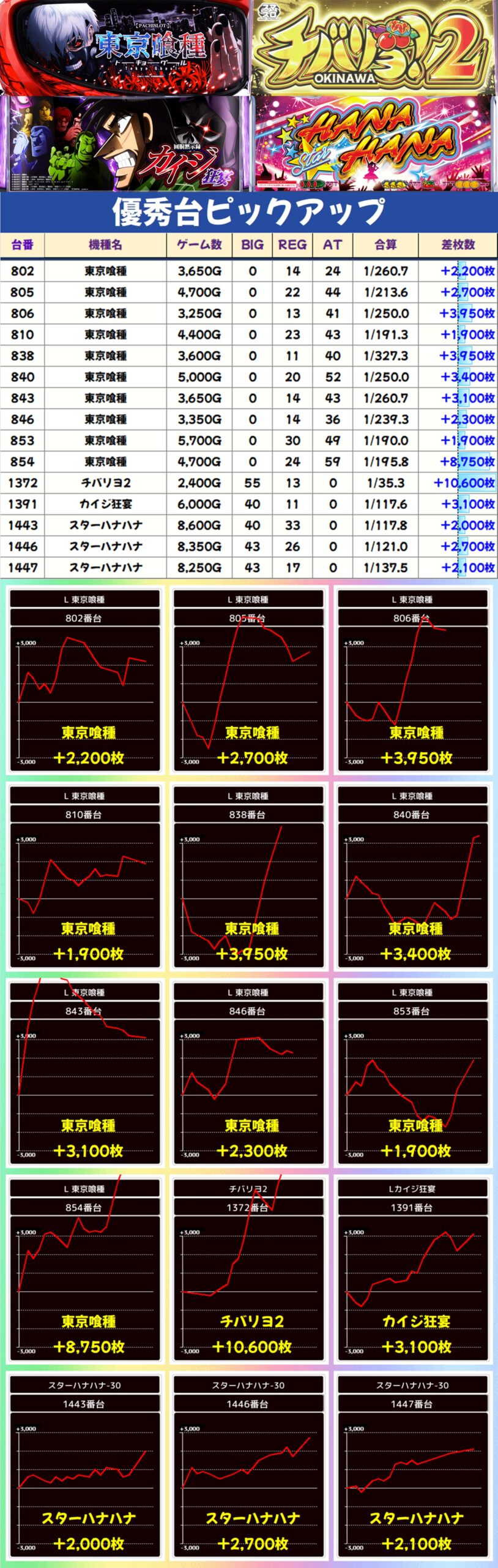 激熱7daysの対象フロアにあるチバリヨ2、カイジ狂宴、スターハナハナに加えて、東京喰種も1/2系濃厚に。東京喰種からは多数の優秀台が出現し、チバリヨ2からは+10600枚の万枚オーバーも!