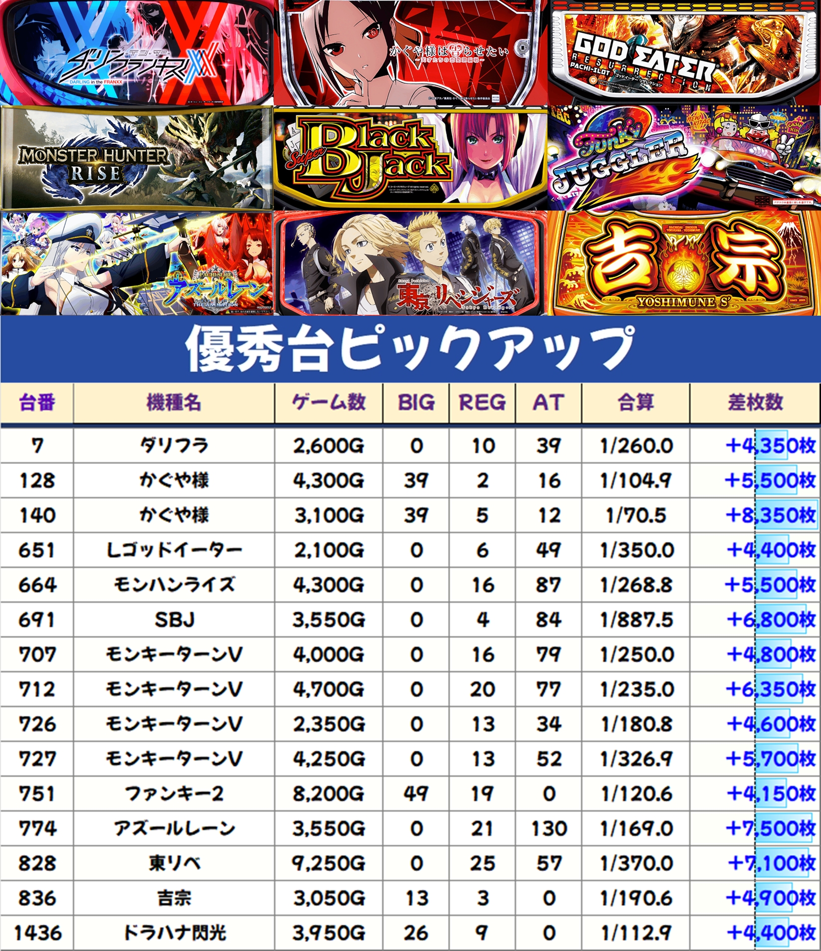 各機種の優秀台をピックアップしますので、データを確認してみましょう!