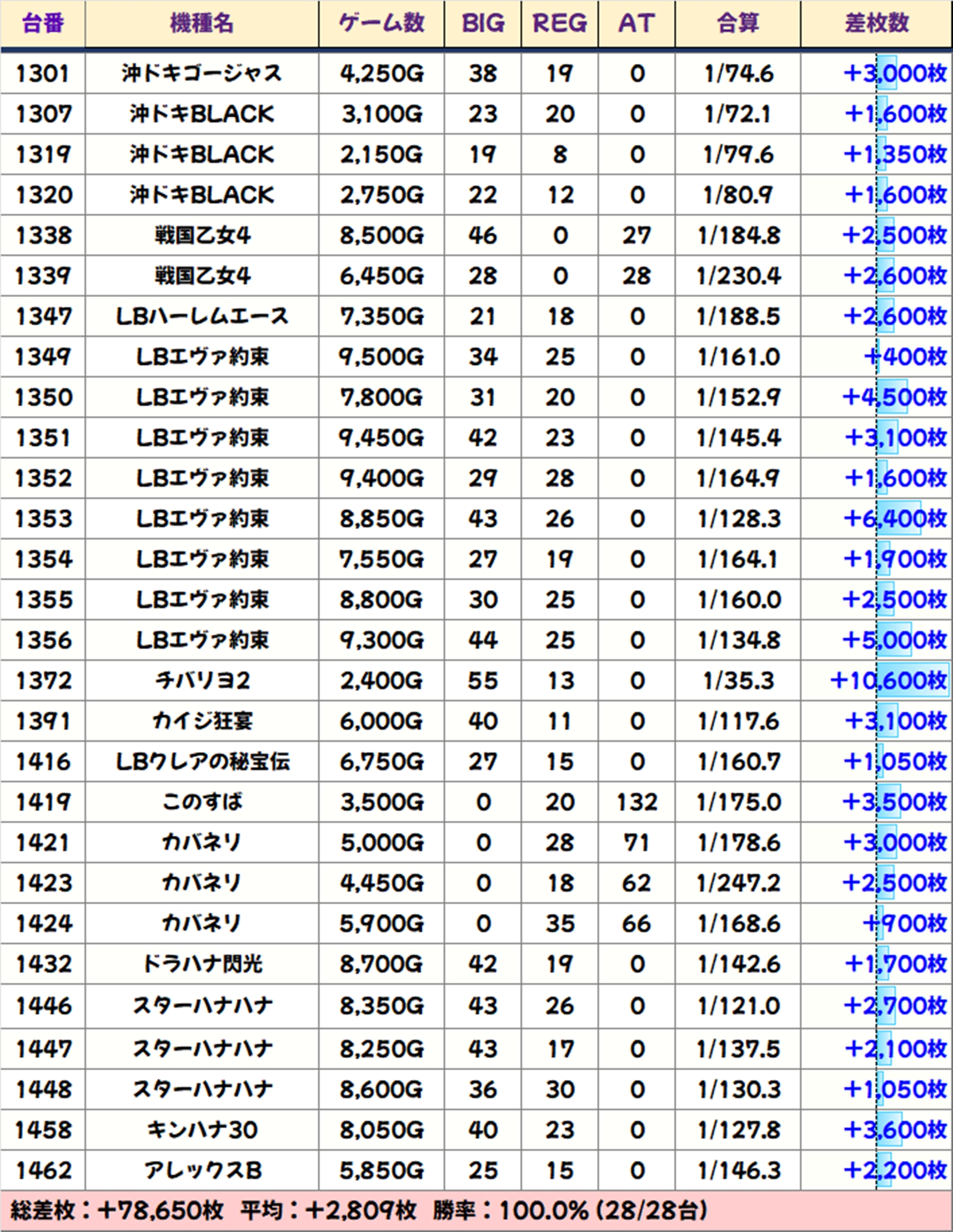 全台系や1/2系濃厚の仕掛けなども絡んでおりましたが、ピックアップの28台は全台がプラスとなり、平均+2809枚の好成績となりましたね!