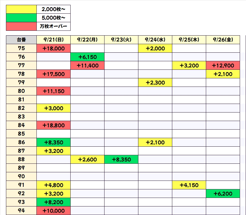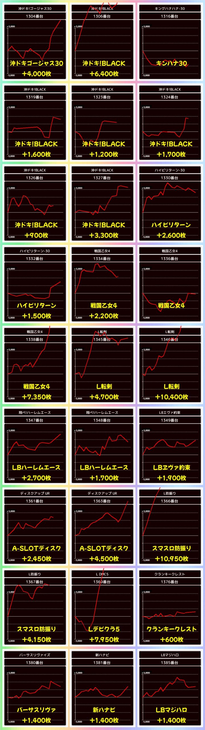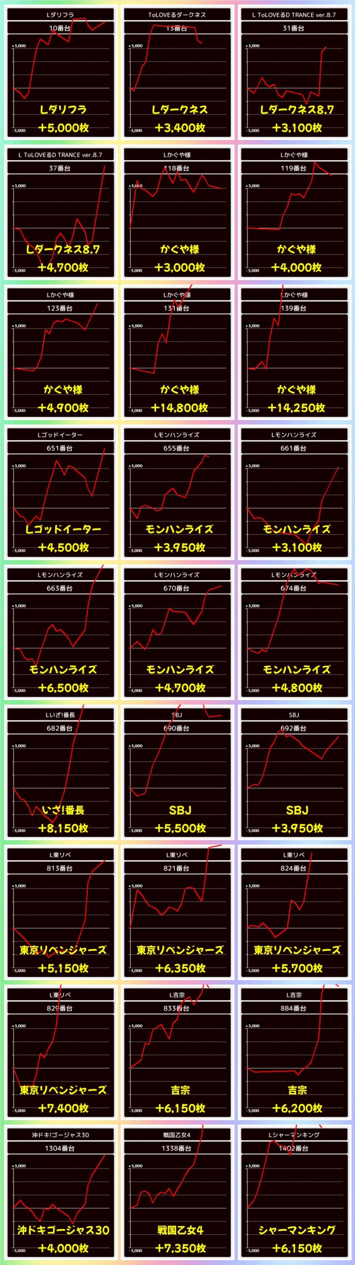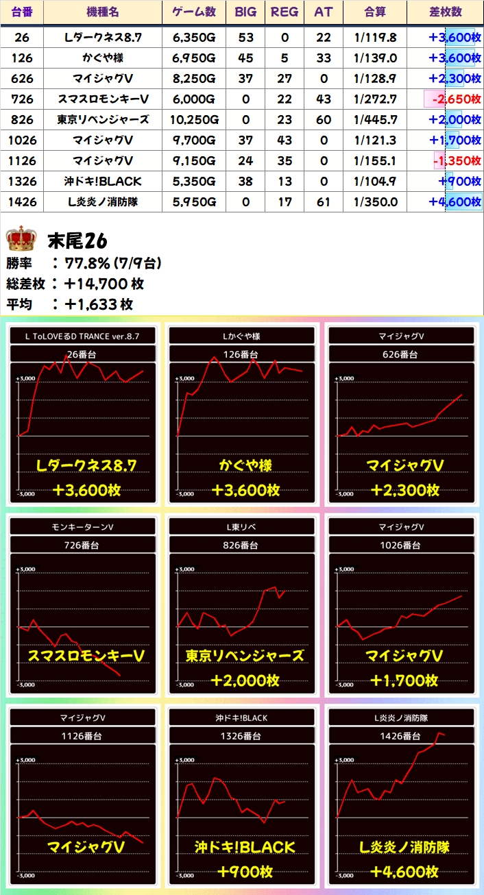 21-27日は日付末尾の仕掛けが恒例となっており、今回の末尾26番台は平均+1633枚という結果に。大半の台が2000枚超のプラスなので、27日も良番を掴んだ際は優先的に狙いたいですね。