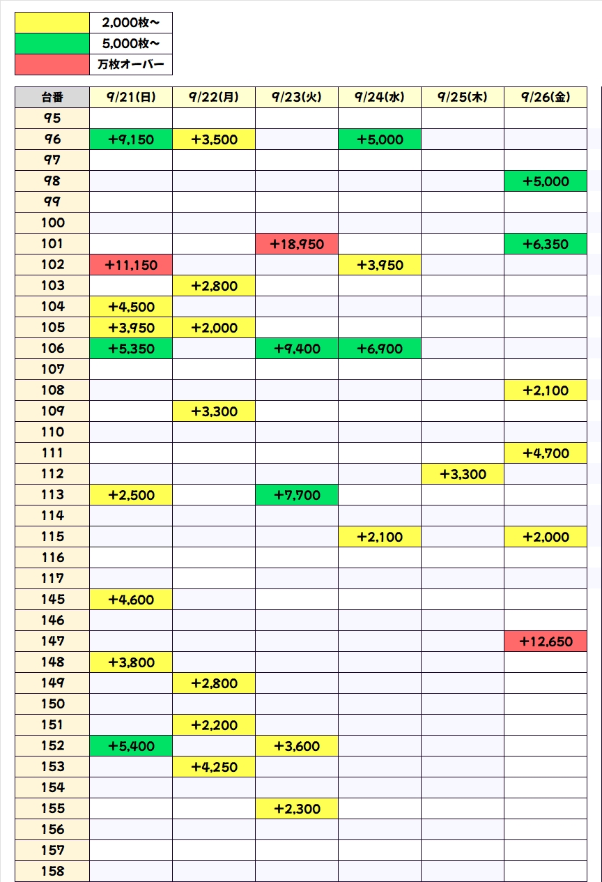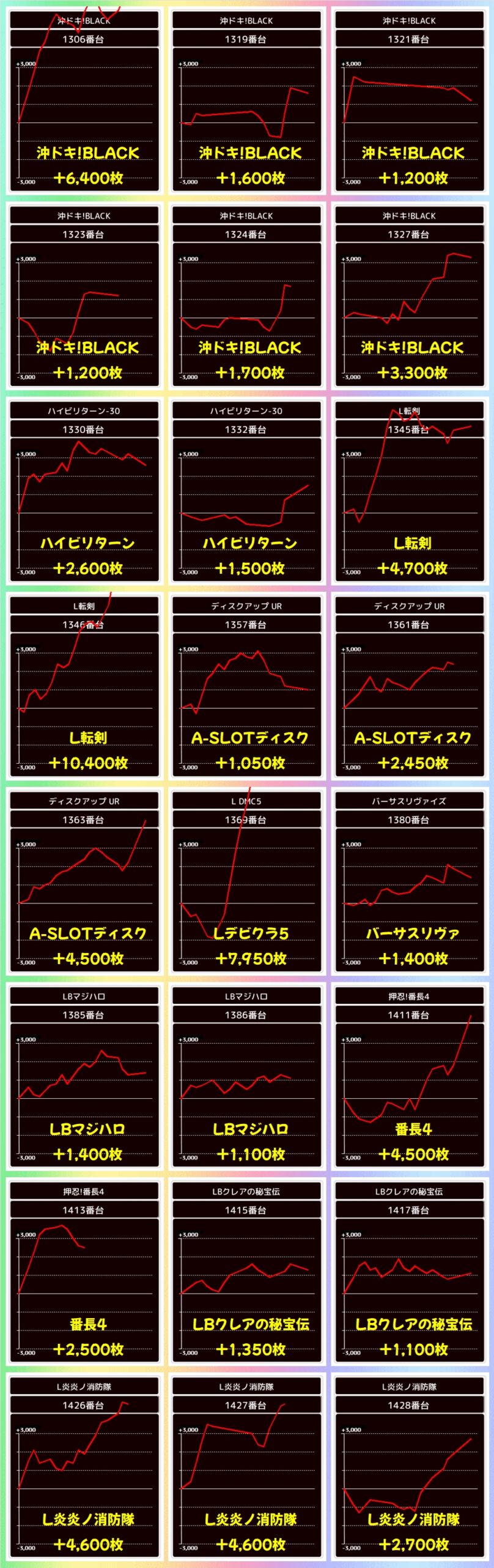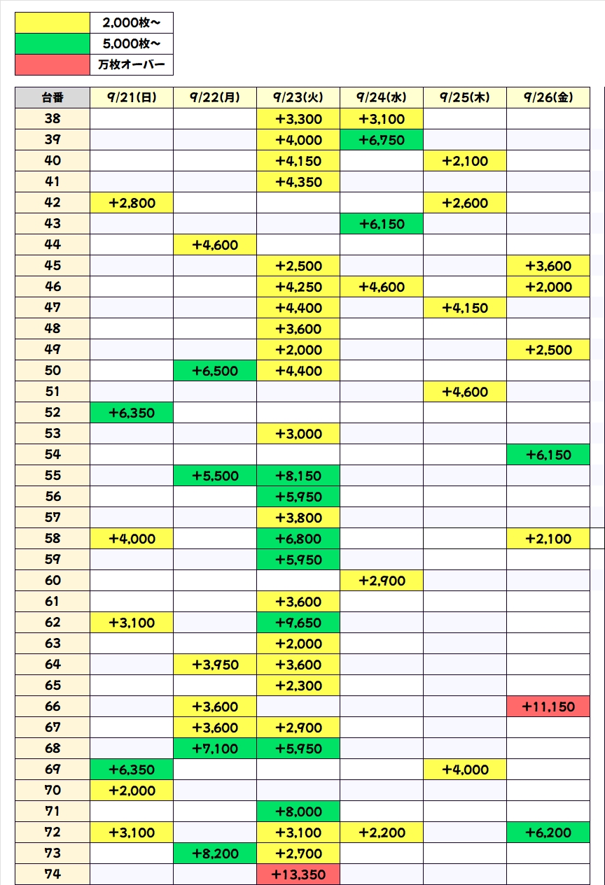 21-27日は日付末尾の仕掛けが恒例となっており、今回の末尾26番台は平均+1633枚という結果に。大半の台が2000枚超のプラスなので、27日も良番を掴んだ際は優先的に狙いたいですね。
