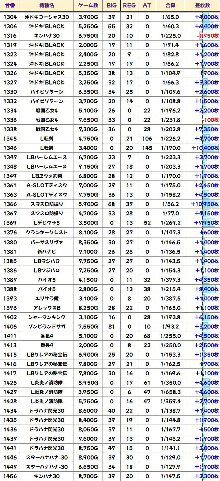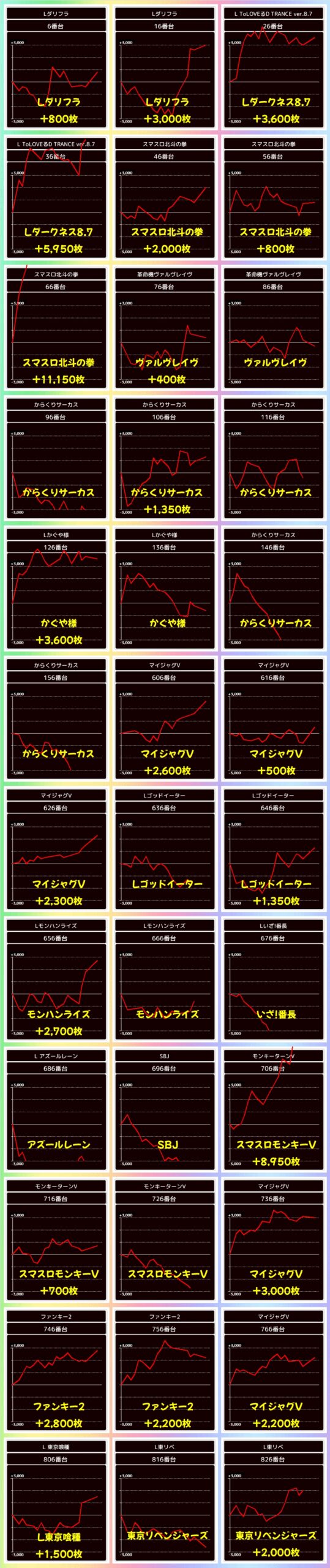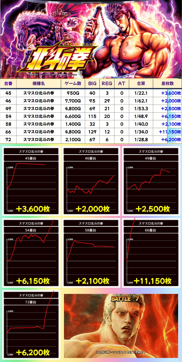 今回はスマスロ北斗の拳に列の仕掛けがありましたが、それらも含めて各機種の優秀台(+2000枚以上)をピックアップしていきます!データをチェックして明日以降の参考にしてください!