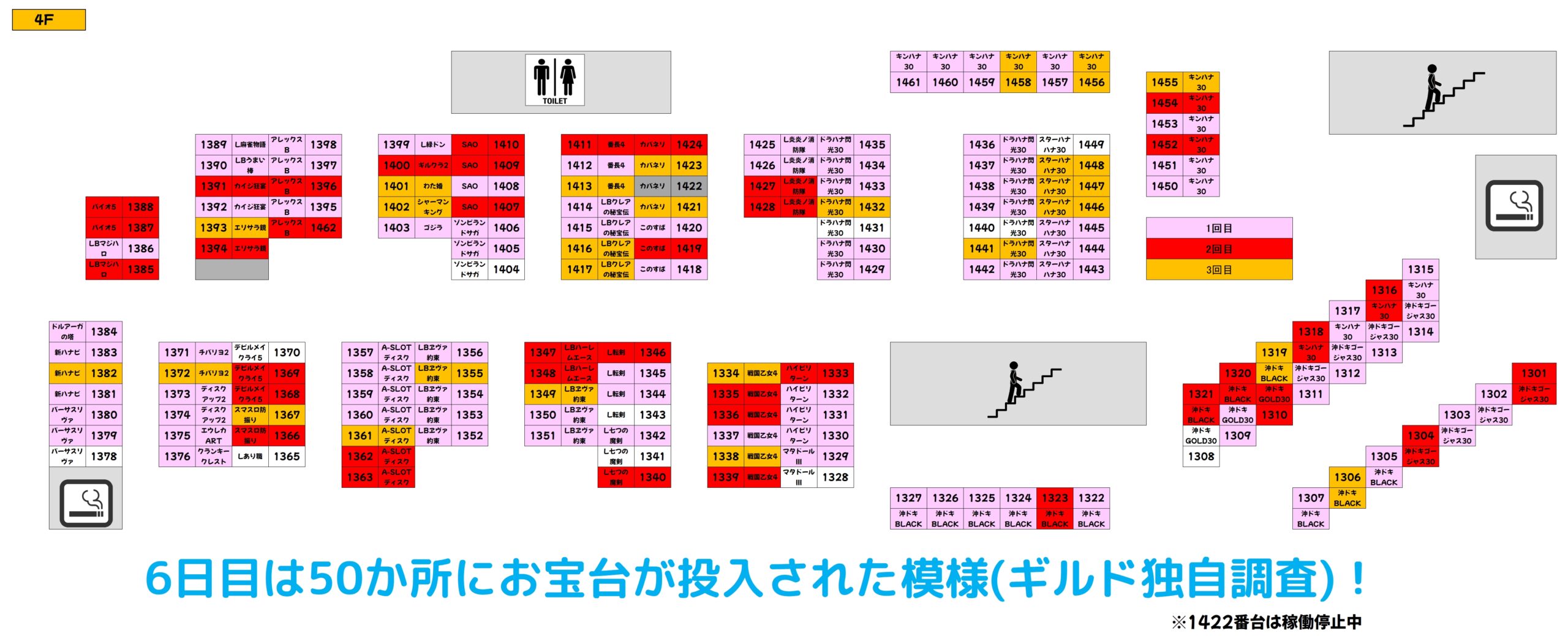 過去の傾向として27日までは対象フロアでのお宝台の大量投入に期待できますので、明日以降は積極的に4Fフロアを狙ってみるのも一つの手段と言えますね。