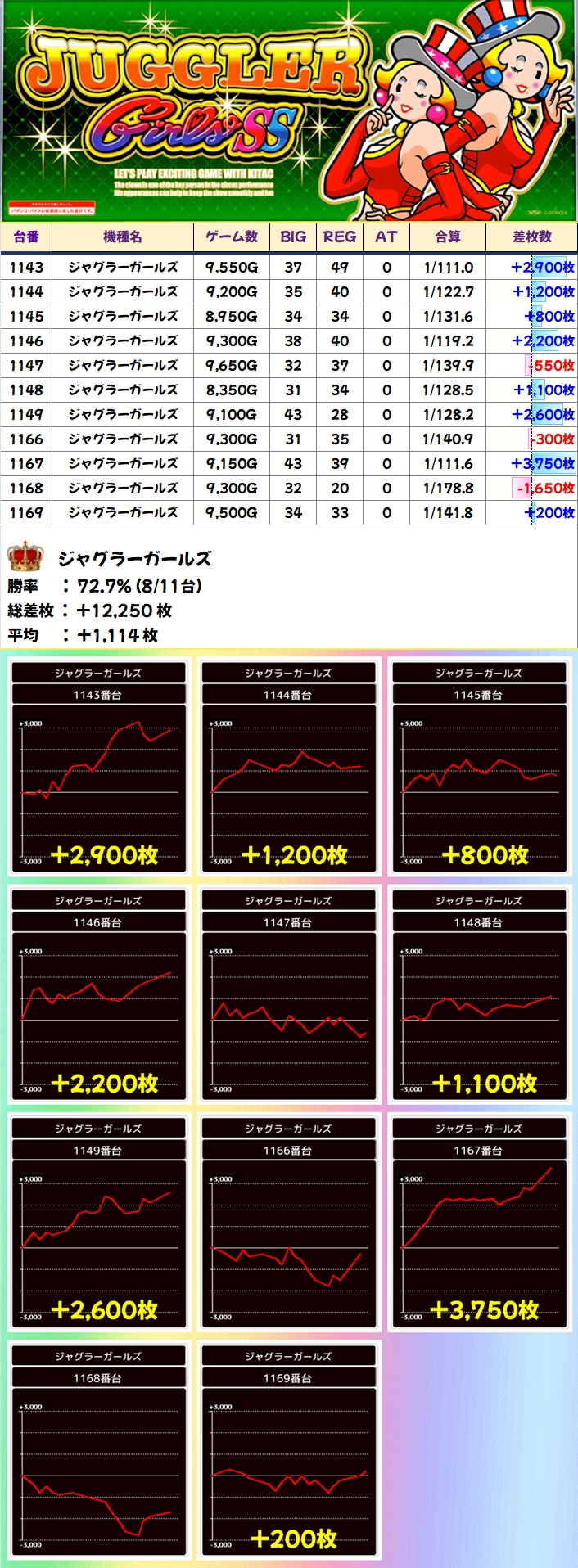 【全台系濃厚】ジャグラーガールズ(8/11台+)→平均+1,114枚