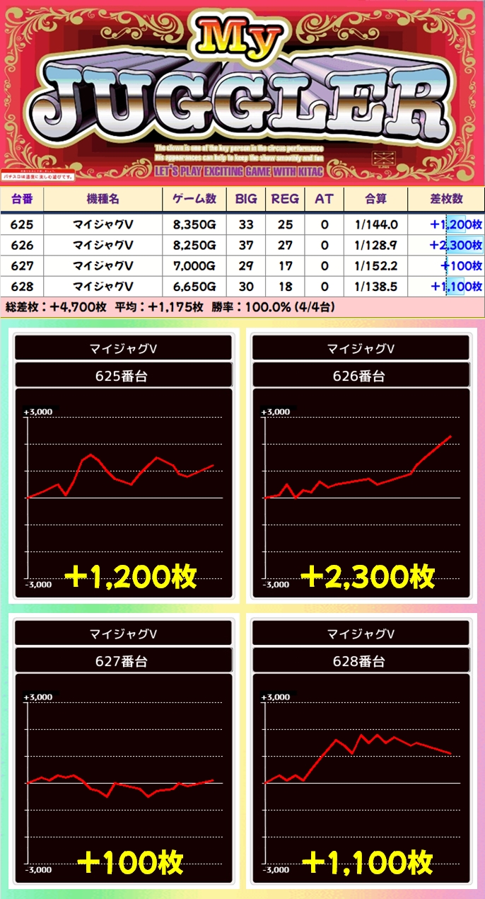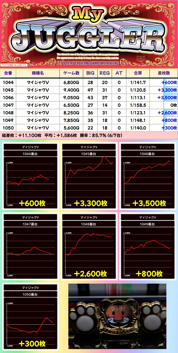 マイジャグからは3000枚オーバーも複数台あり、モンキーVの8000枚超、ヴヴヴの12000枚オーバーと各機種からド派手な結果も飛び出しました。