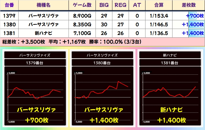【3台並び】バーサス&新ハナビ(1379-1381番台)→平均+1,167枚