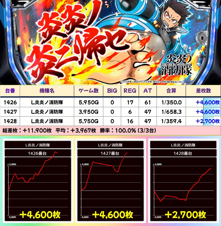 【3台並び】炎炎ノ消防隊(1426-1428番台)→平均+3,967枚