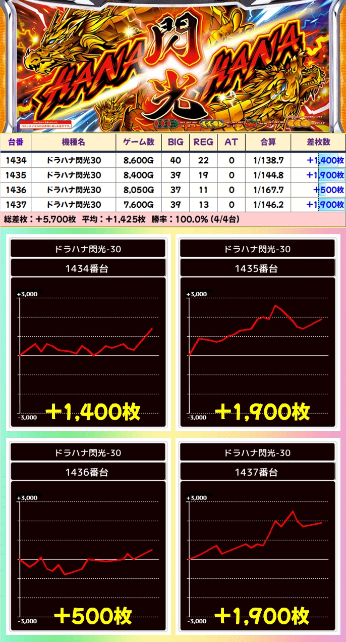 【4台並び】ドラハナ閃光(1434-1437番台)→平均+1,425枚