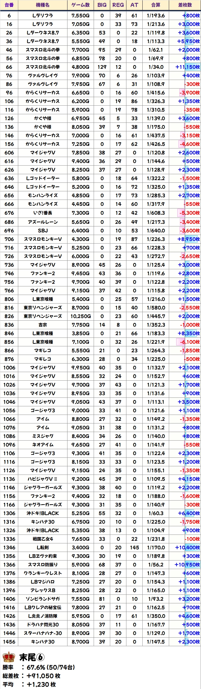 【末尾】末尾⑥(50/74番台)→平均+1,230枚