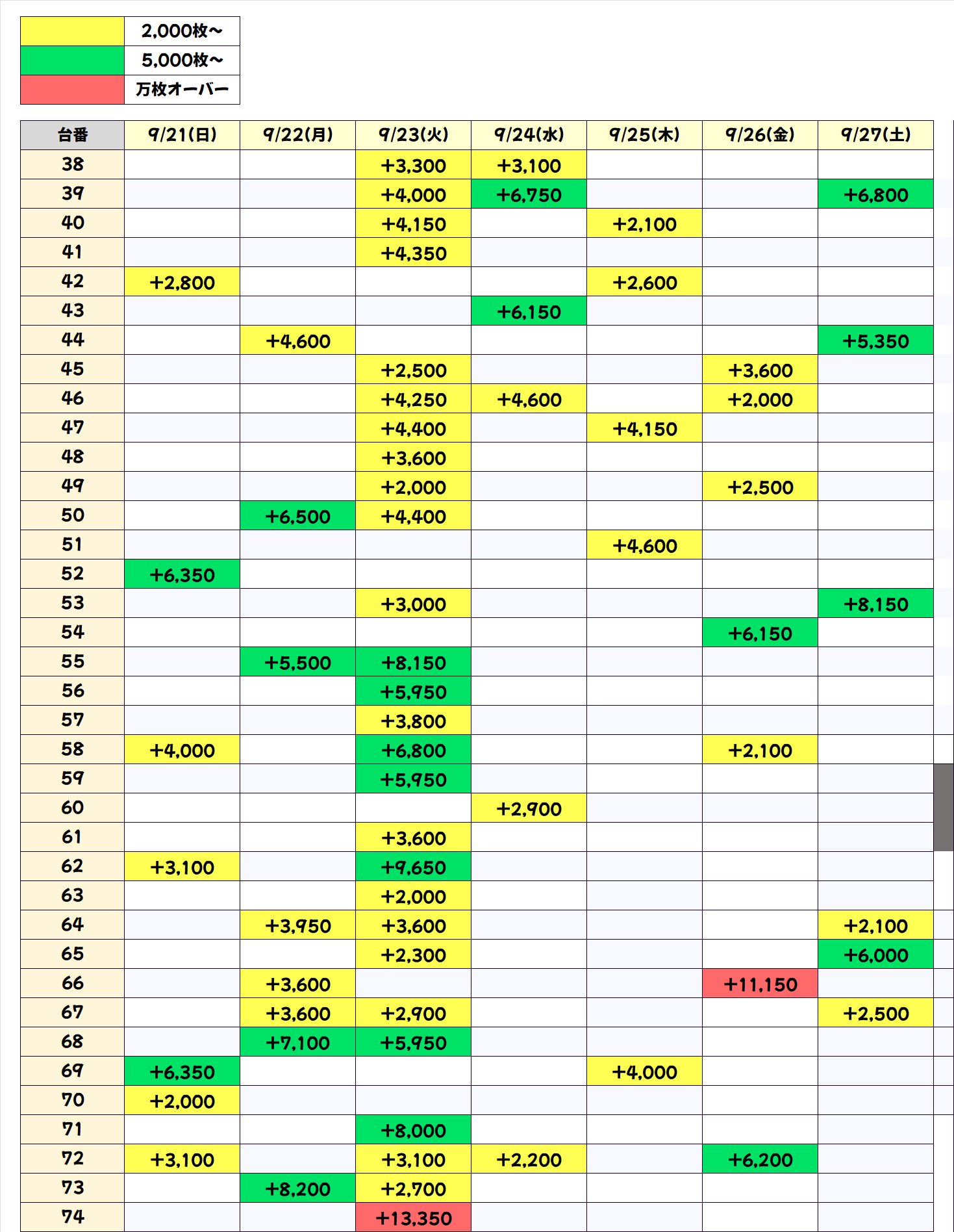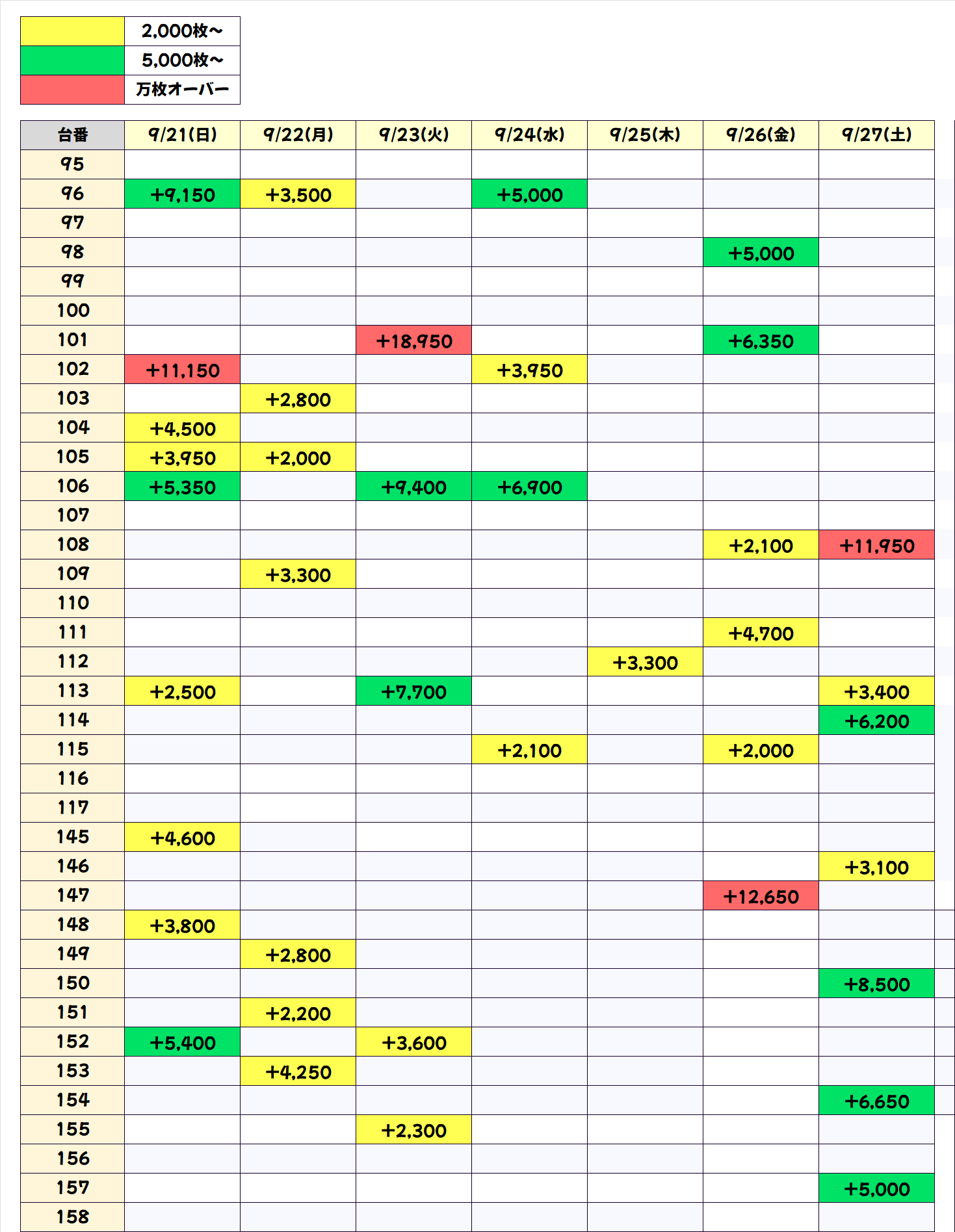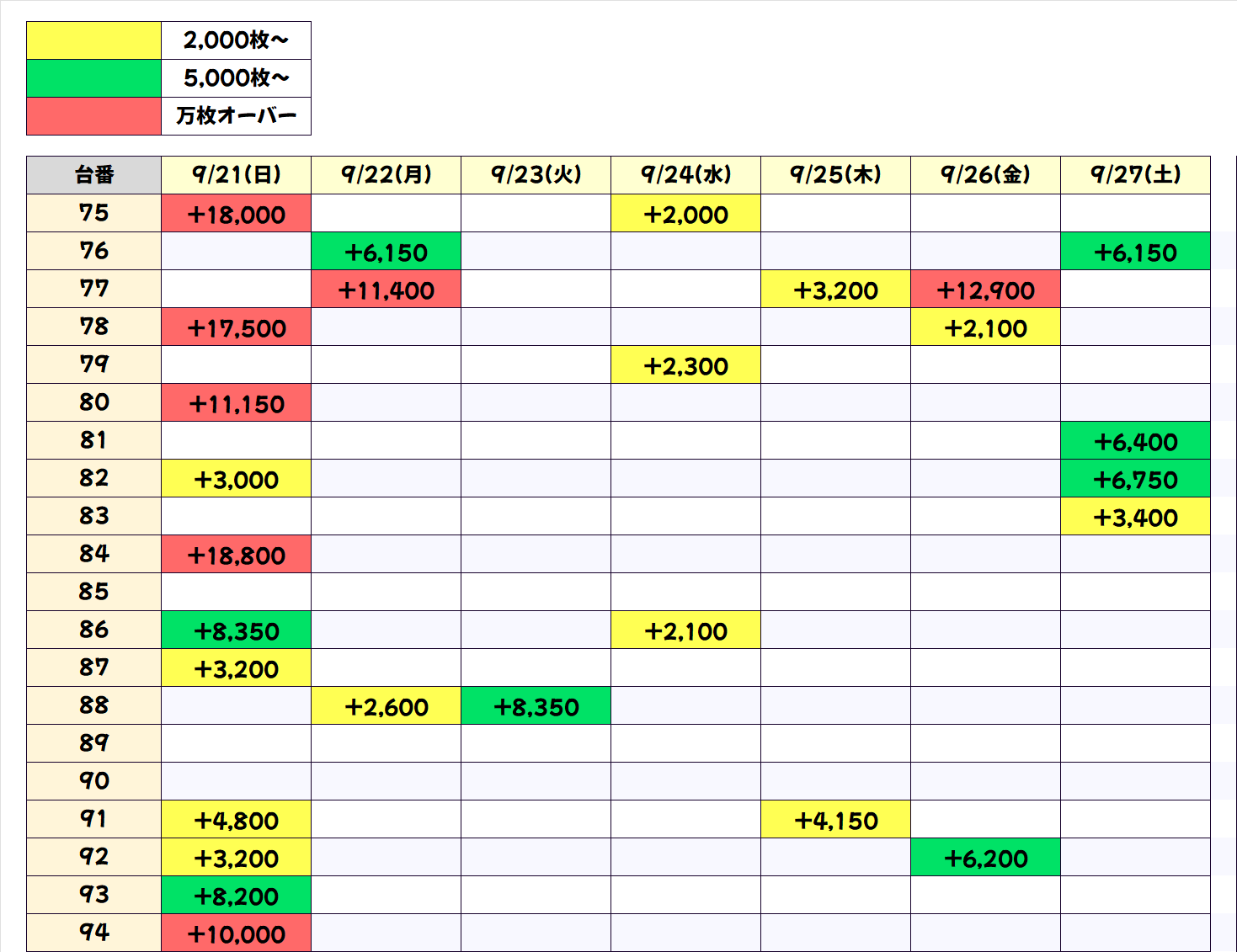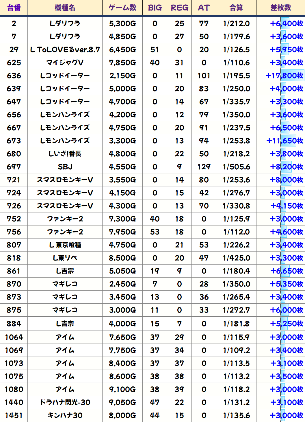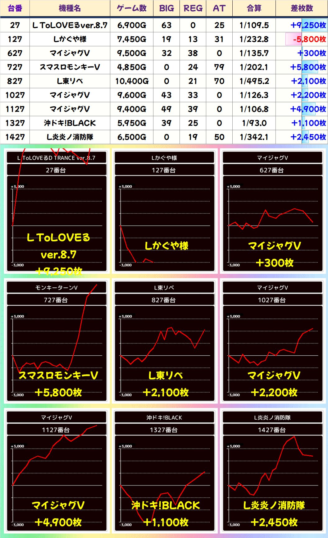 7のつく日ということで3台以上設置機種には1台以上の優秀台アリ!そのため、単品優秀台も多数という結果になりました。