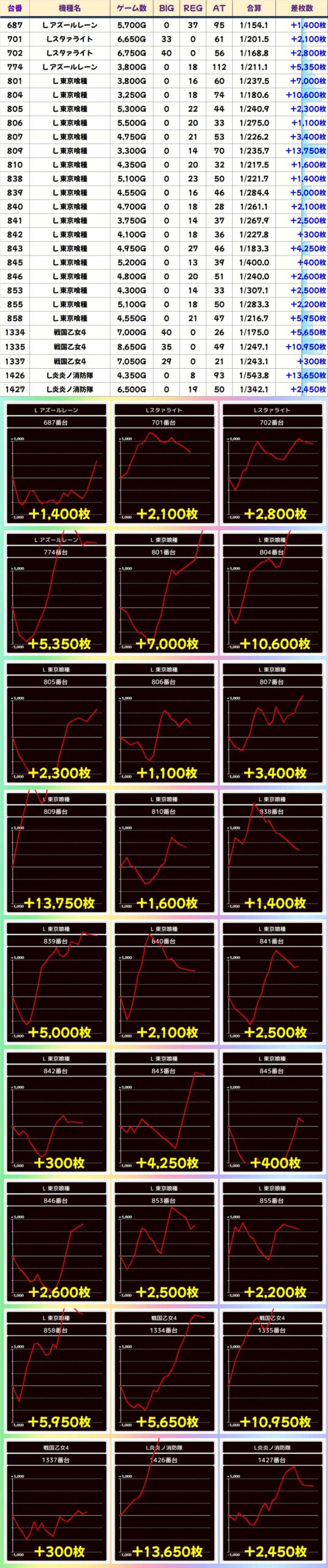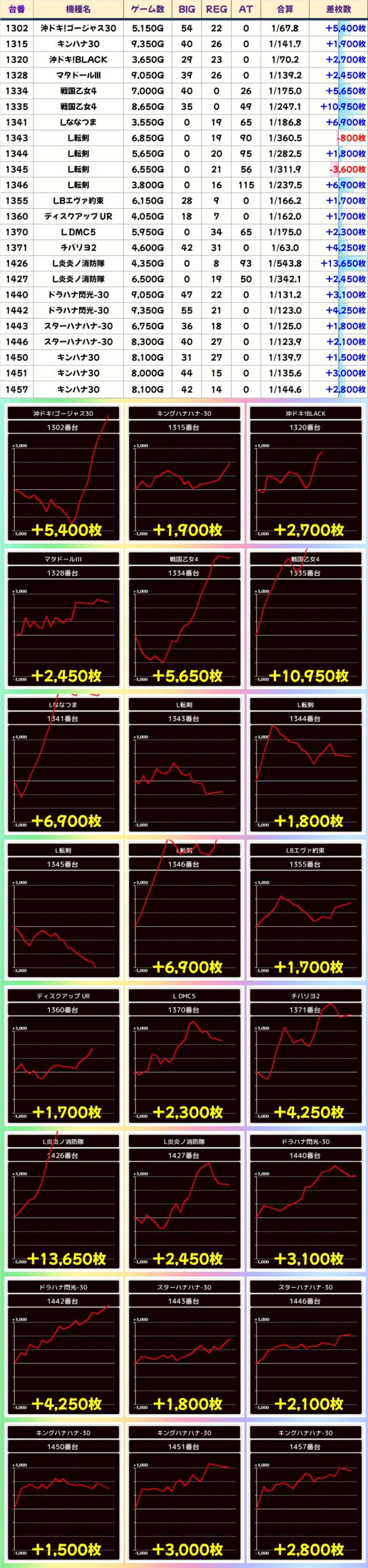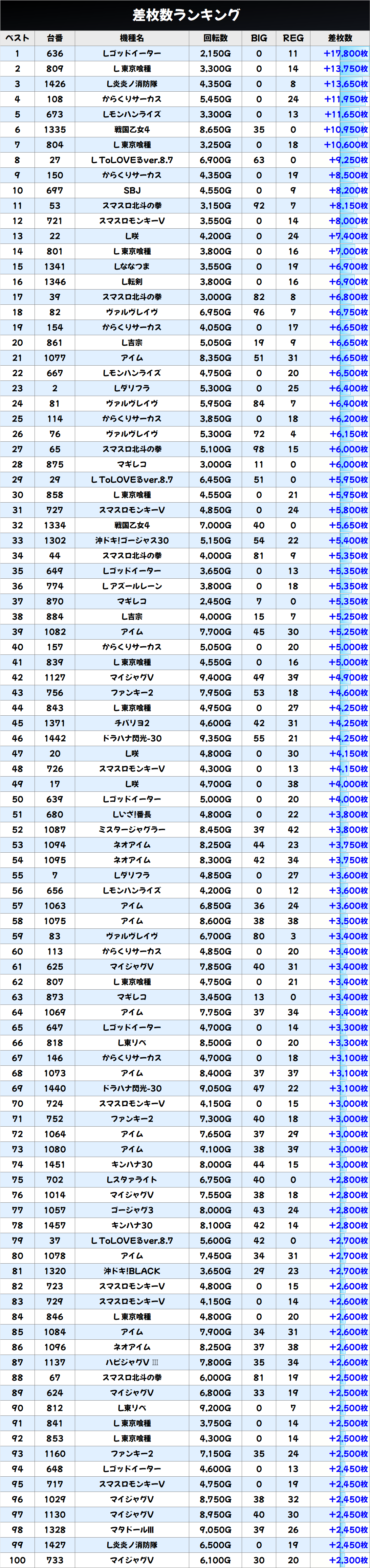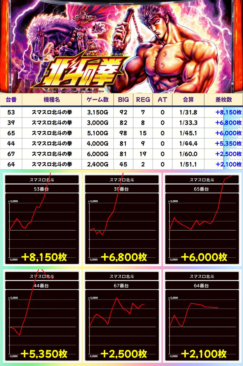 今回はスマスロ北斗の拳に列の仕掛けがありましたが、それらも含めて各機種の優秀台(+2000枚以上)をピックアップしていきます!データをチェックして明日以降の参考にしてください!